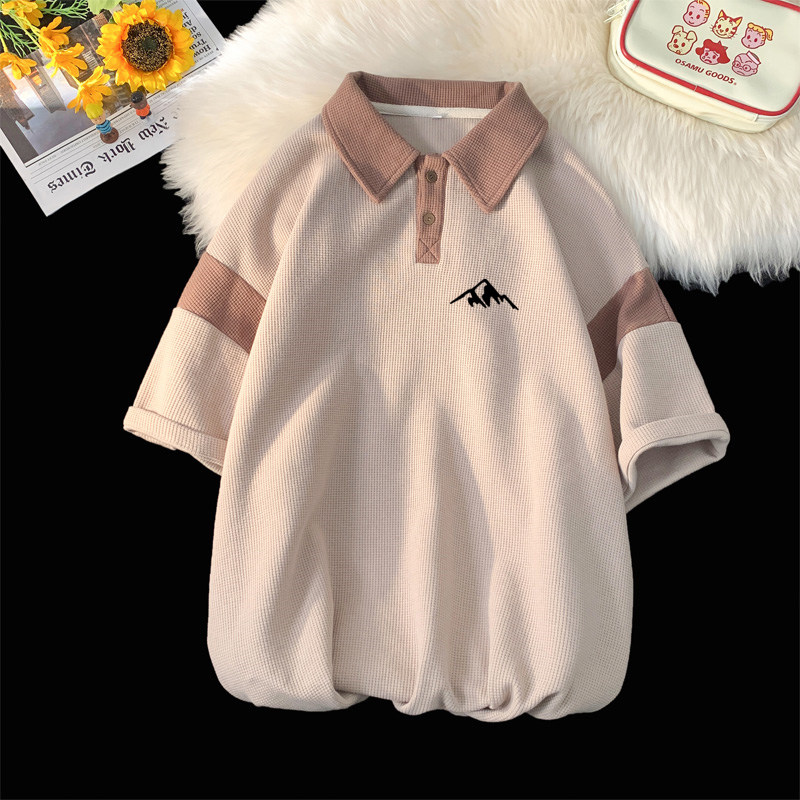 港风小清新POLO衫男短袖夏季华夫格潮牌高级感宽松半袖t恤青少年