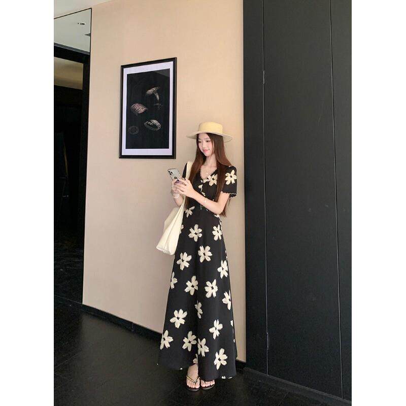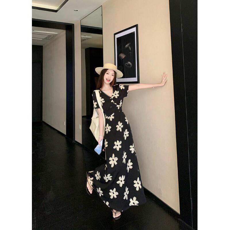 大码胖mm海边度假风v领印花连衣裙女夏季收腰泡泡袖复古a字长裙子