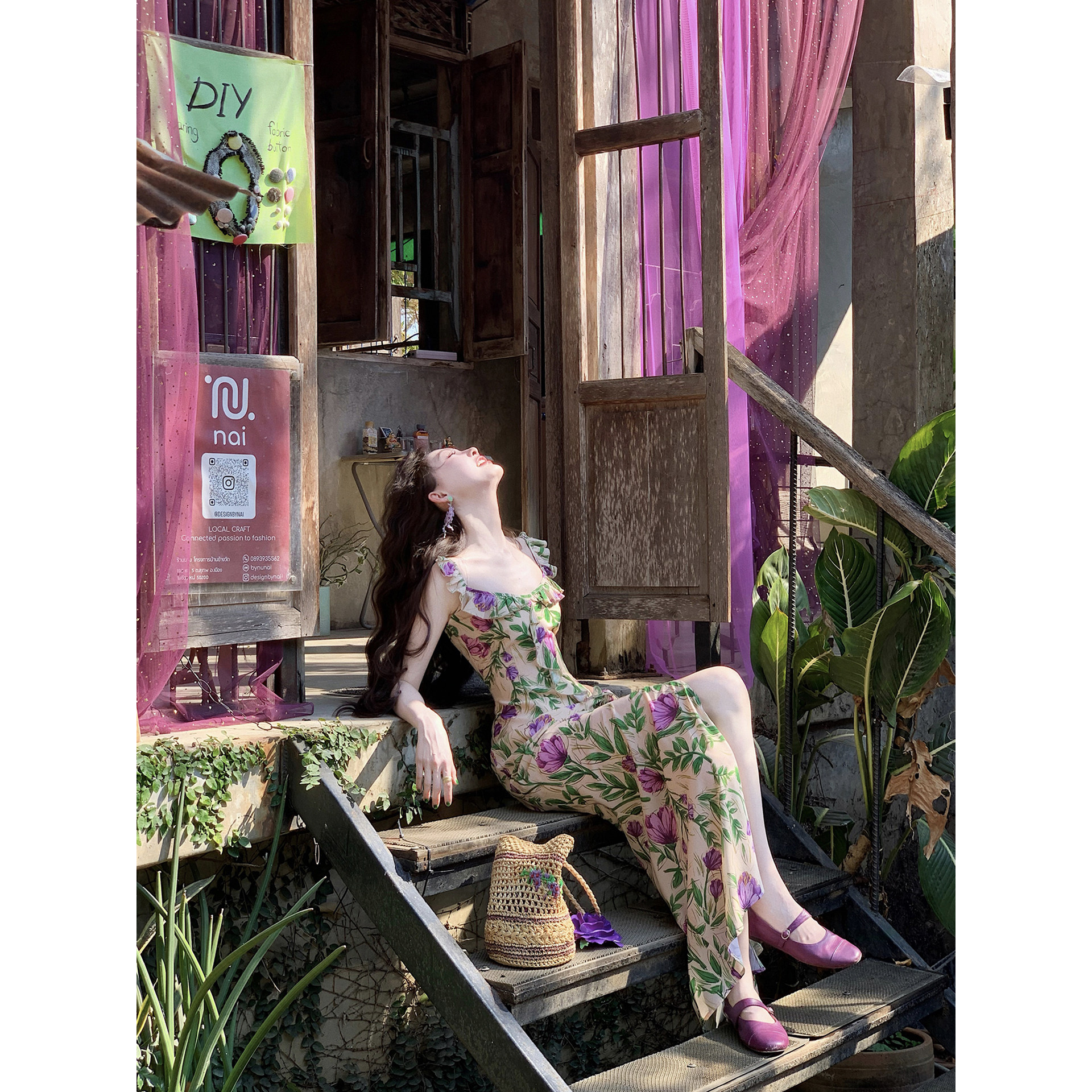吃绿色菜【莫奈紫园】法式复古印花连衣裙女收腰显瘦度假风长裙