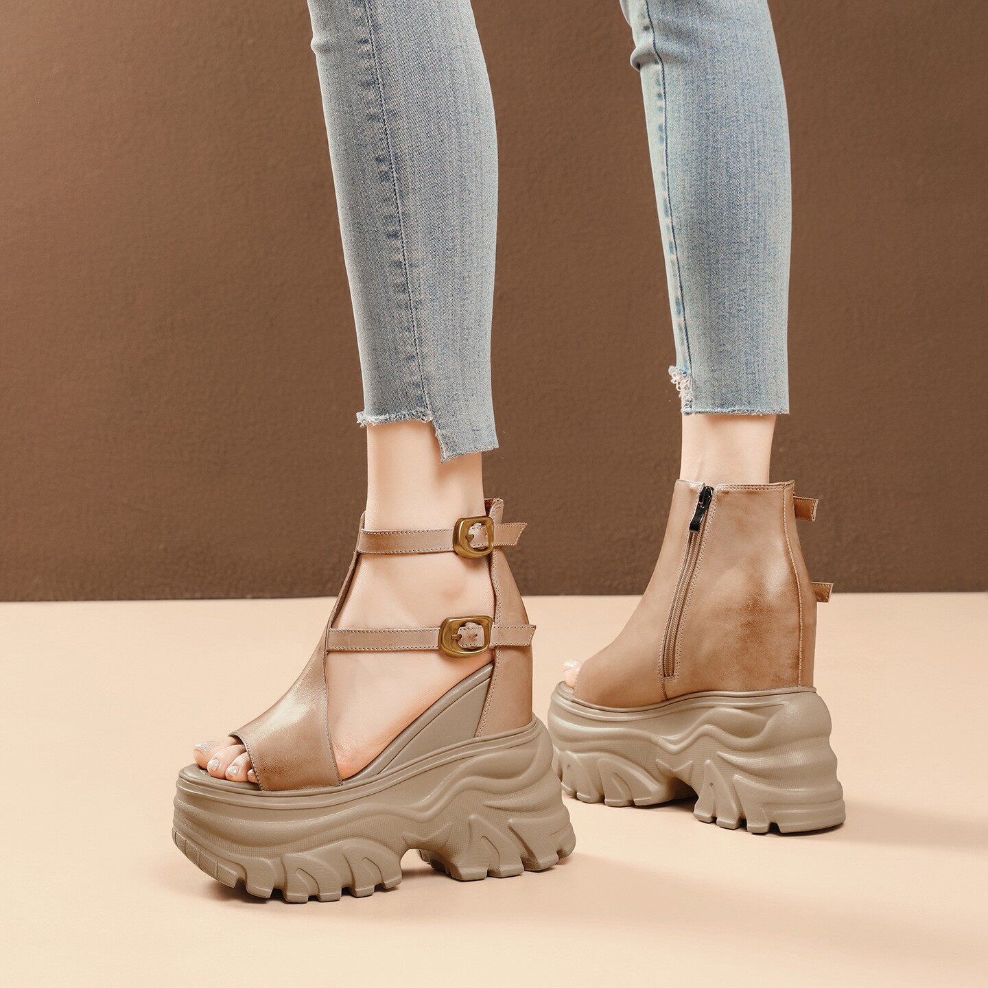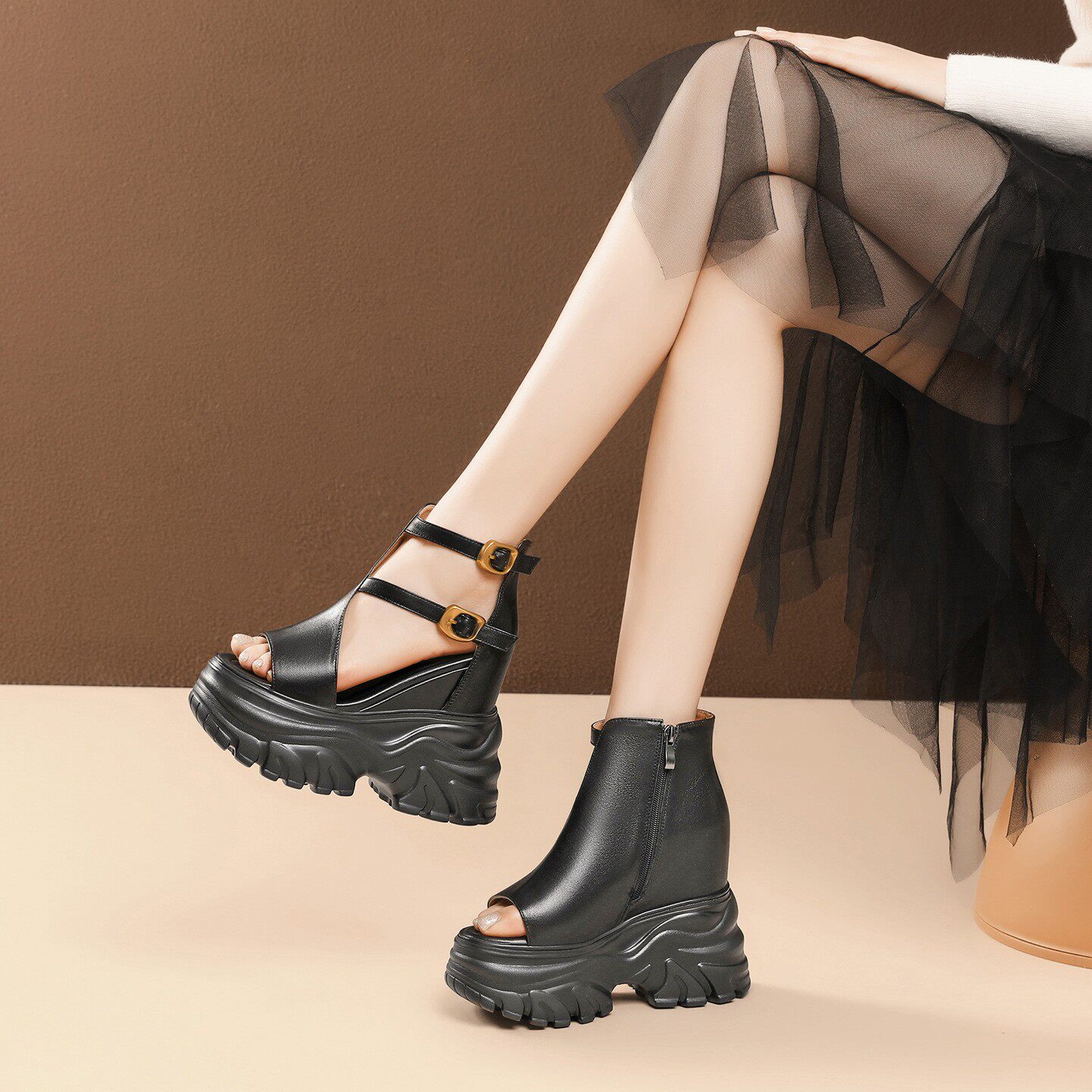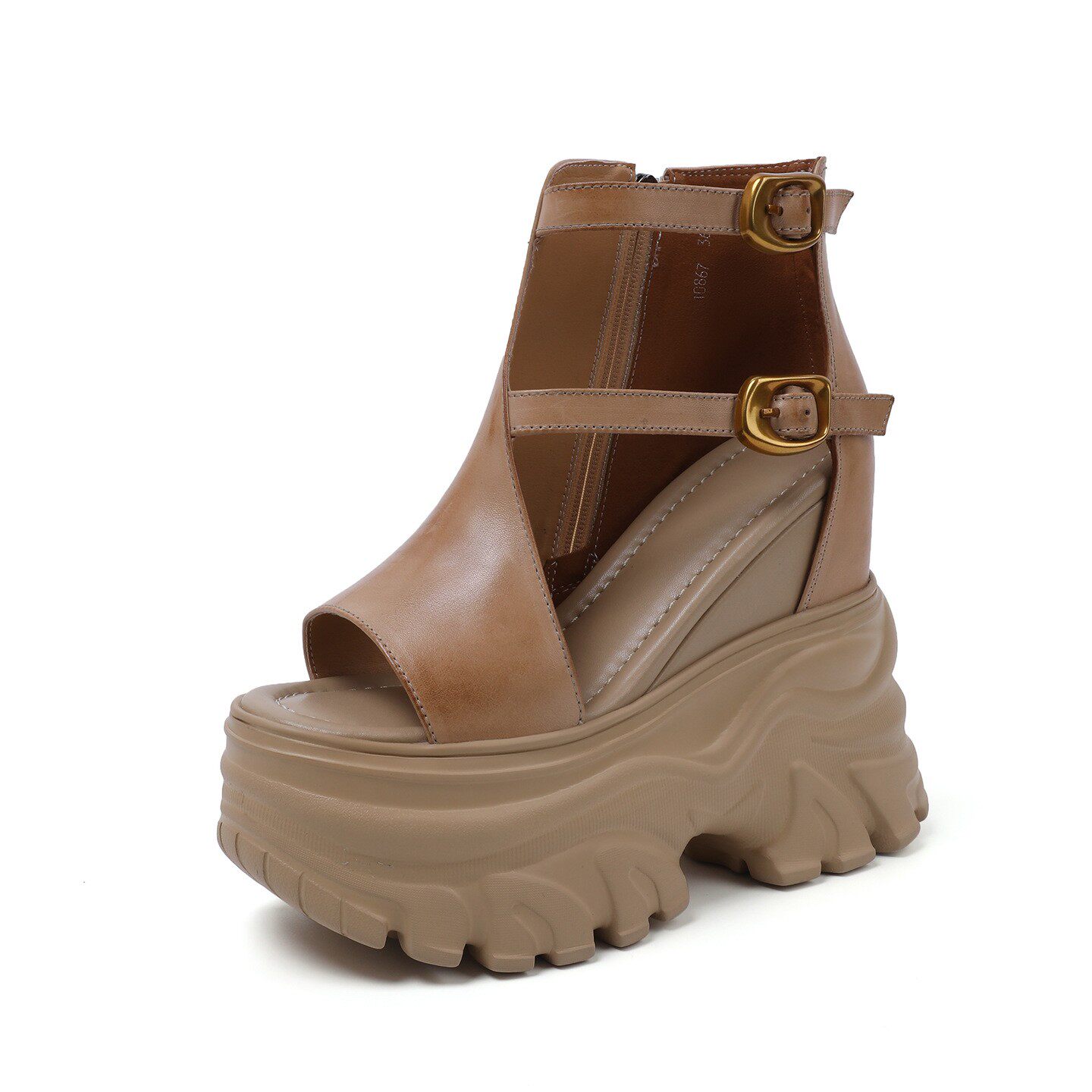 欧洲站真皮内增高14CM马丁靴女夏季头层牛皮鱼嘴凉鞋松糕厚底鞋子
