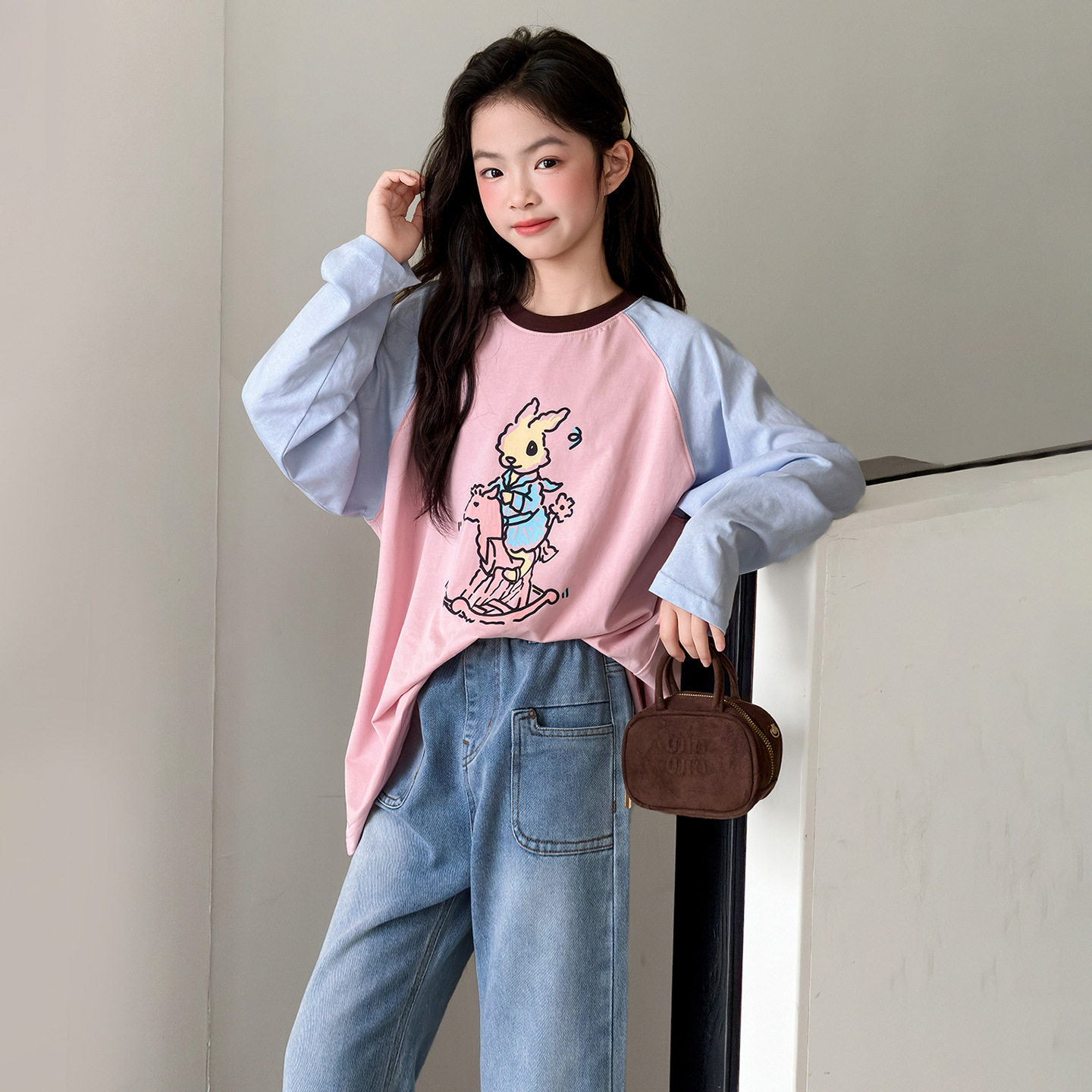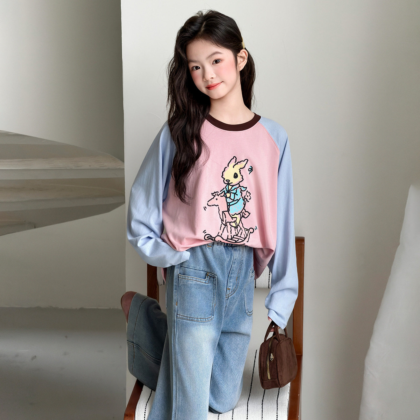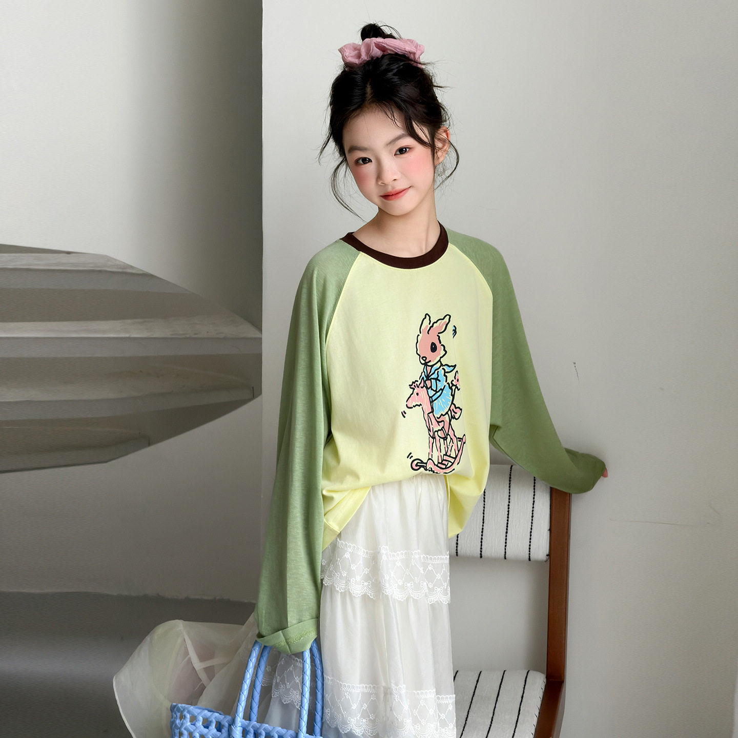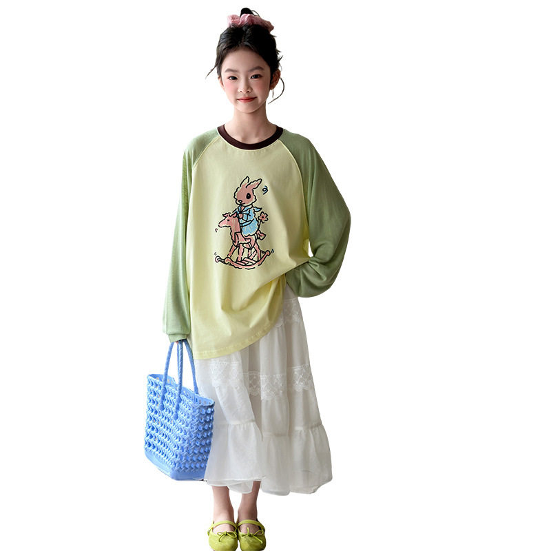 女童春款T恤纯棉上衣2026新款儿童网红中大童插肩袖撞色打底衫潮
