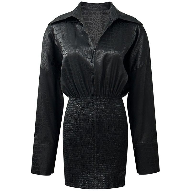咖色压褶缎面衬衫裙女春季新款轻熟风V领长袖垂感短款包臀连衣裙