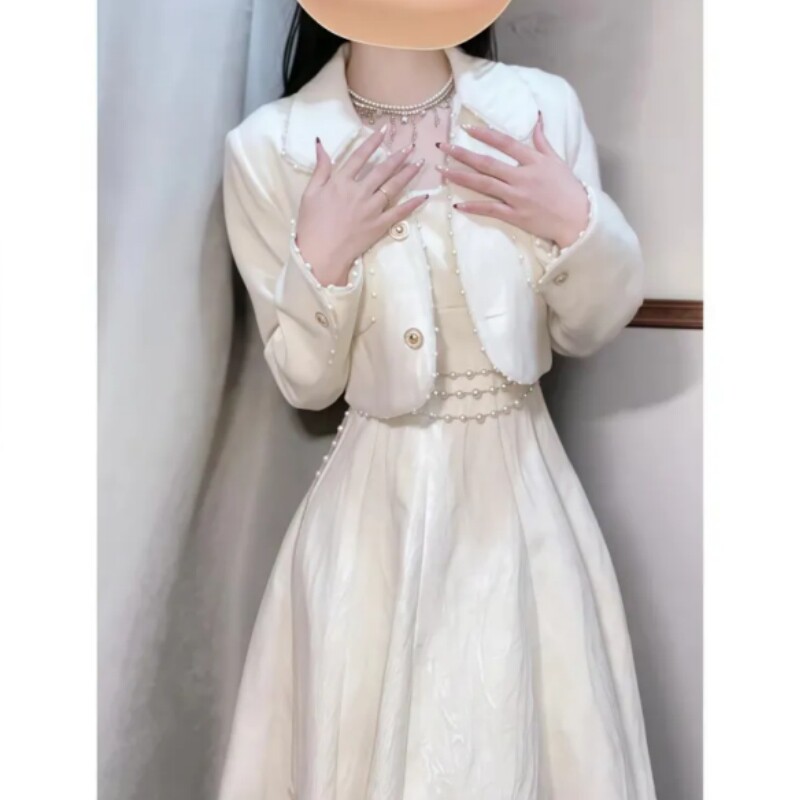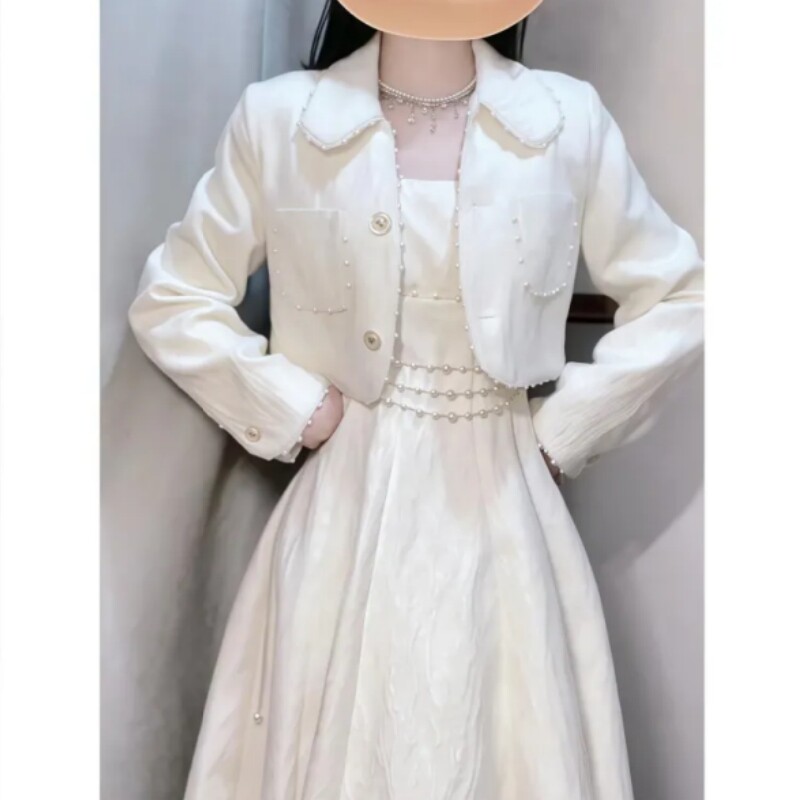韩系千金感套装女春季高级感收腰显瘦吊带连衣裙重工短款长袖外套