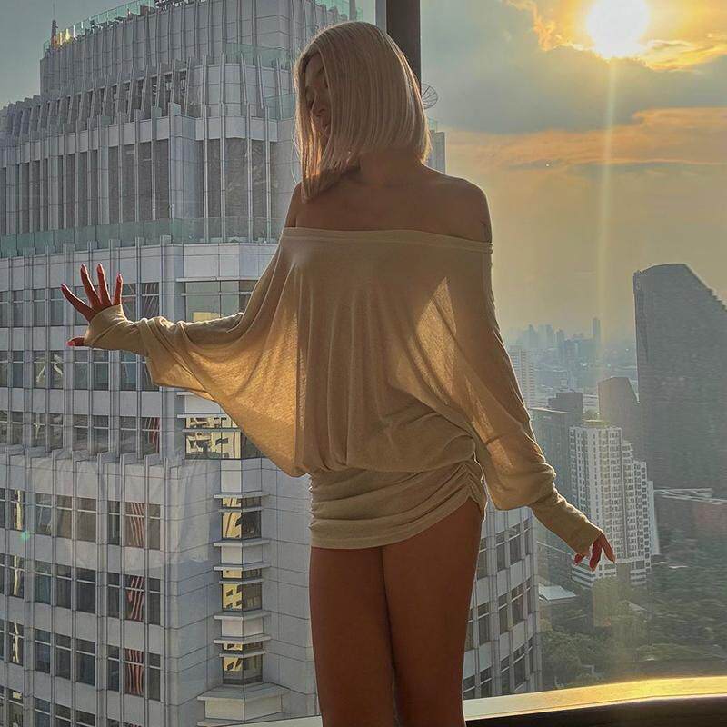 纯欲风一字肩长袖连衣裙2026春季新款辣妹修身褶皱显瘦包臀短裙女