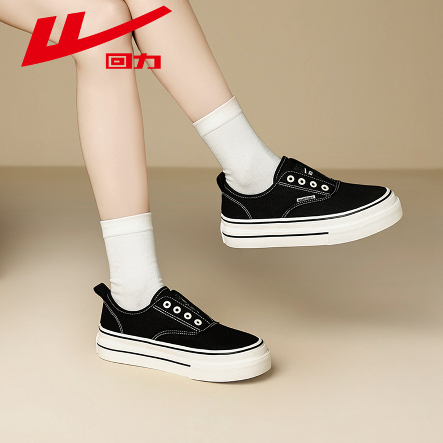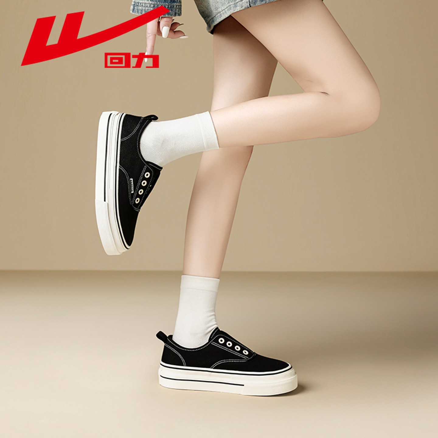 回力女鞋一脚蹬帆布鞋2026春季新款黑色百搭懒人休闲鞋子厚底板鞋