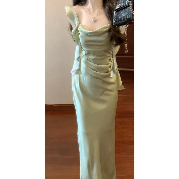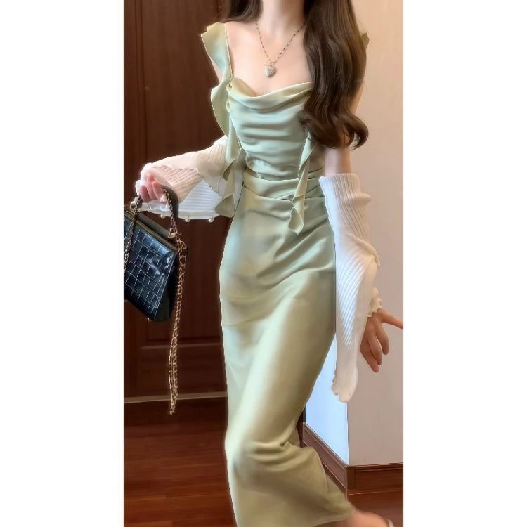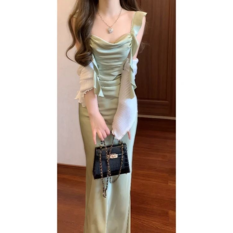 名媛优雅设计领领吊带连衣裙长袖开衫女夏季新款大码修身显瘦套装