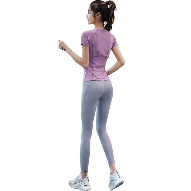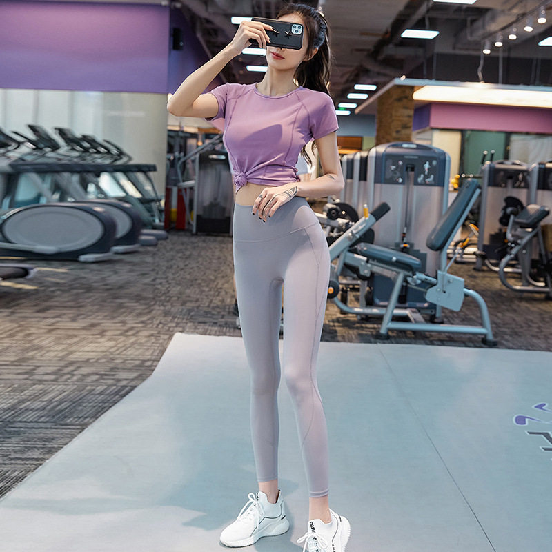 定制瑜伽服套装女短袖T恤长裤带含胸垫收腹提臀运动工作印LOGO字