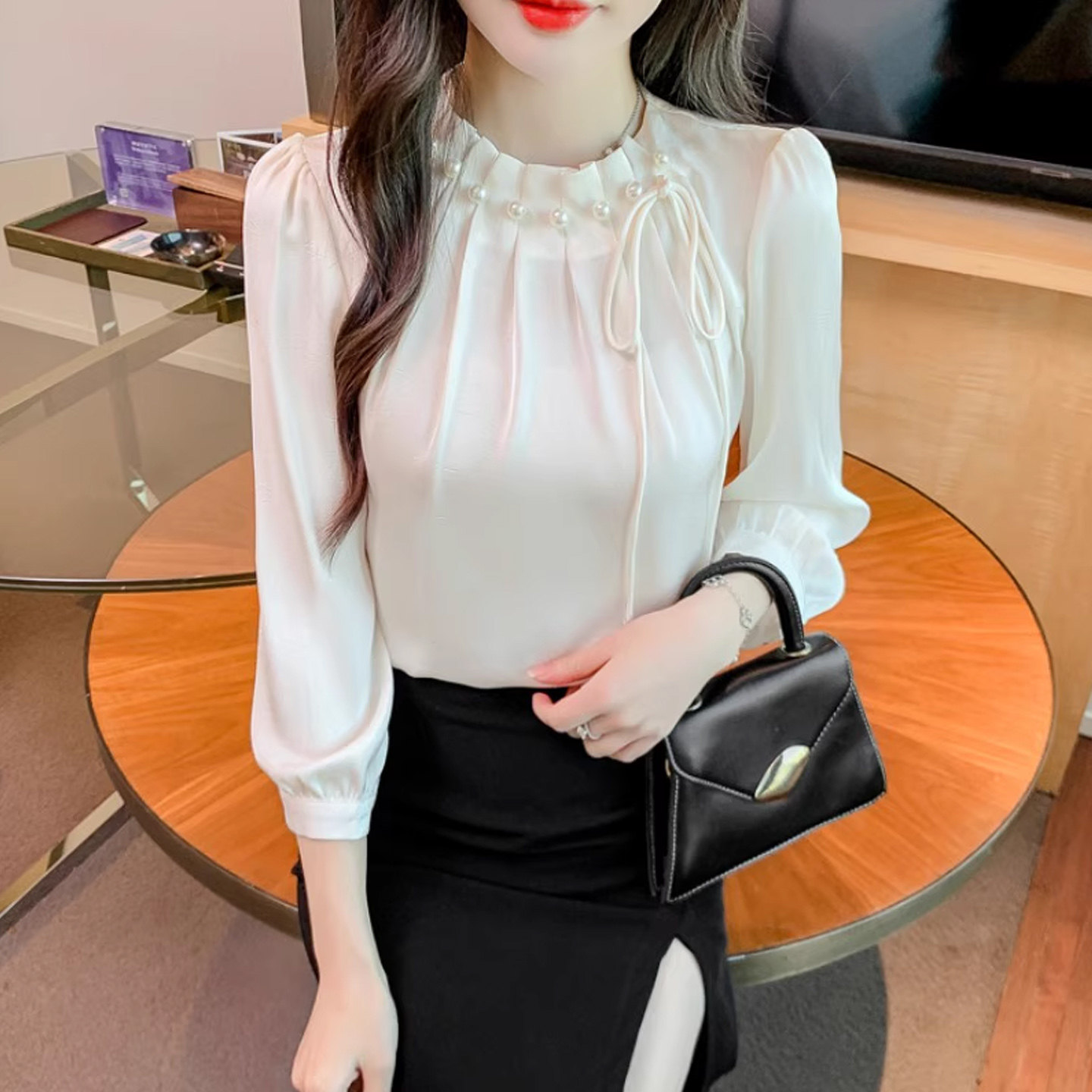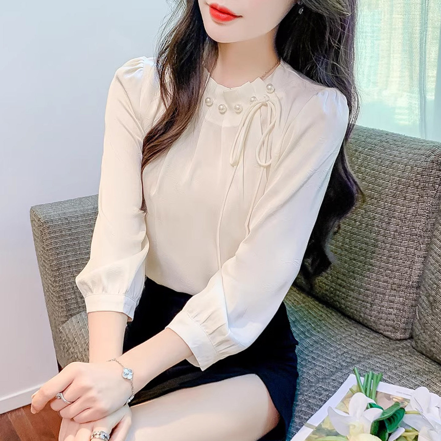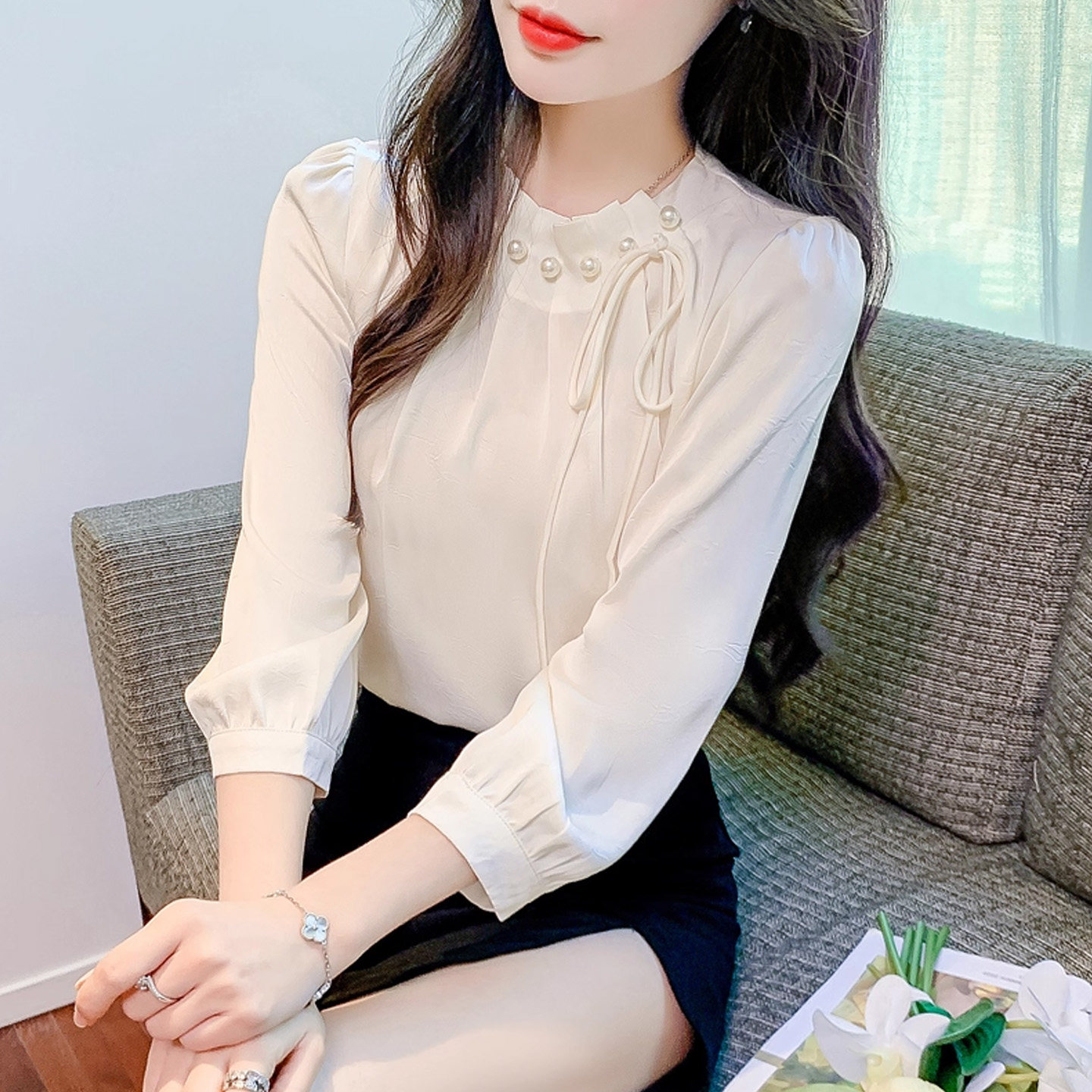 缎面衬衫女款2026新款早春超好看单穿上衣法式钉珠七分袖显瘦衬衣