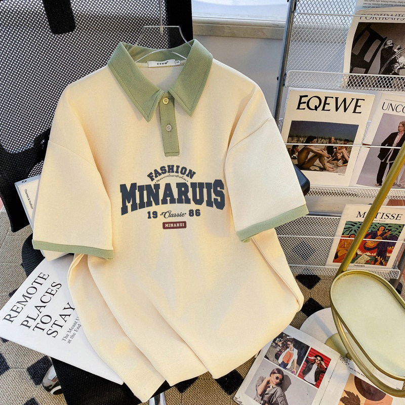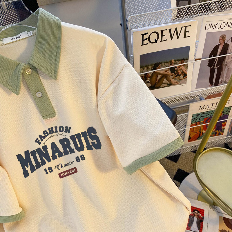 韩版美式短袖夏季翻领上衣2026年夏新款修身外穿复古女款卡通印花