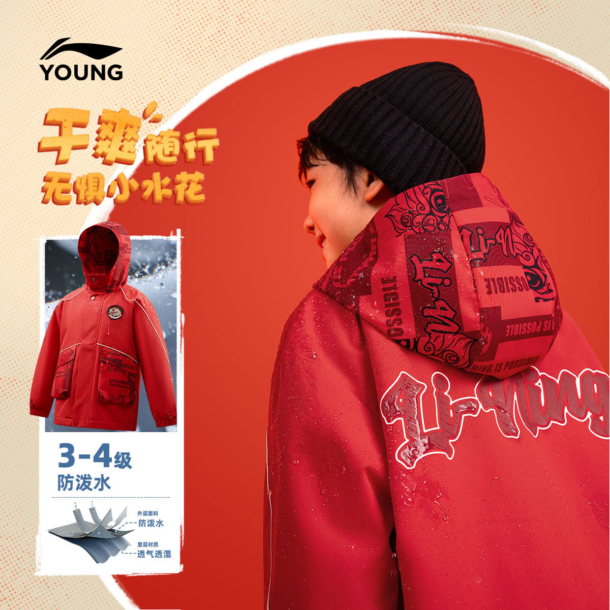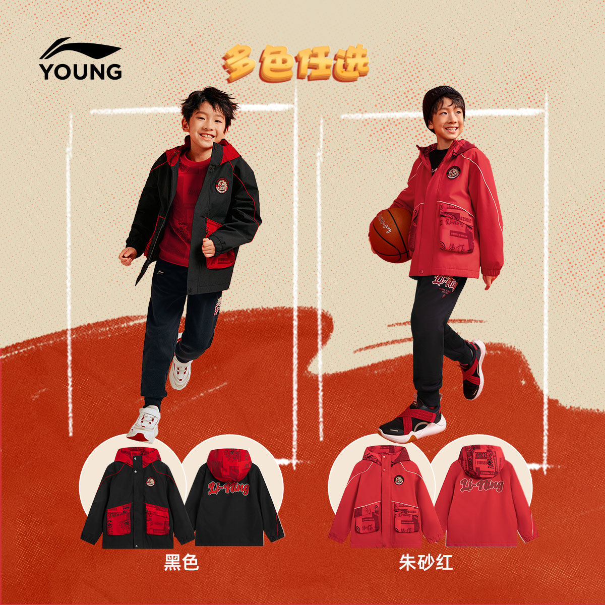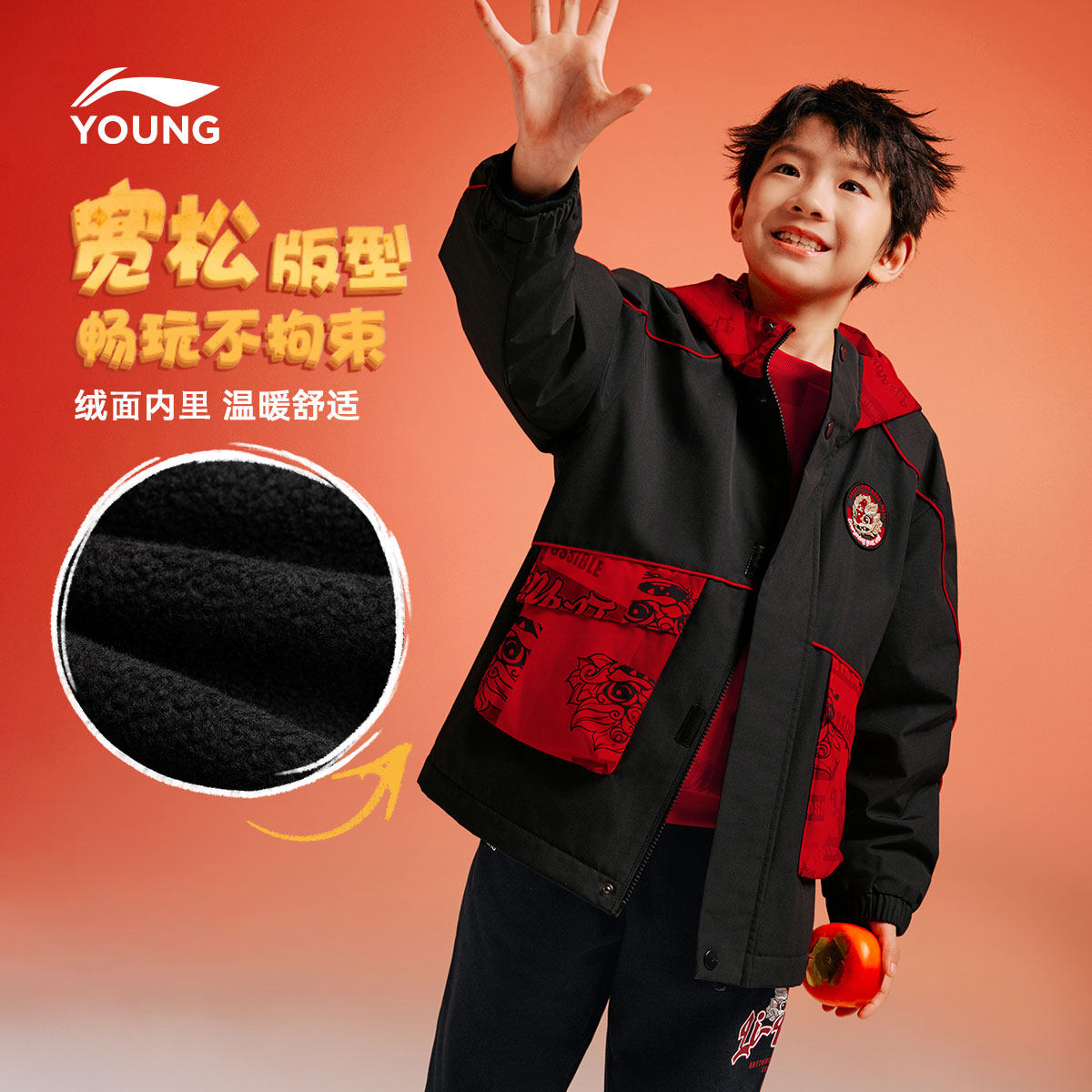 李宁加绒外套新款保暖本命年衣服男童装中大童女童装新年红色外套