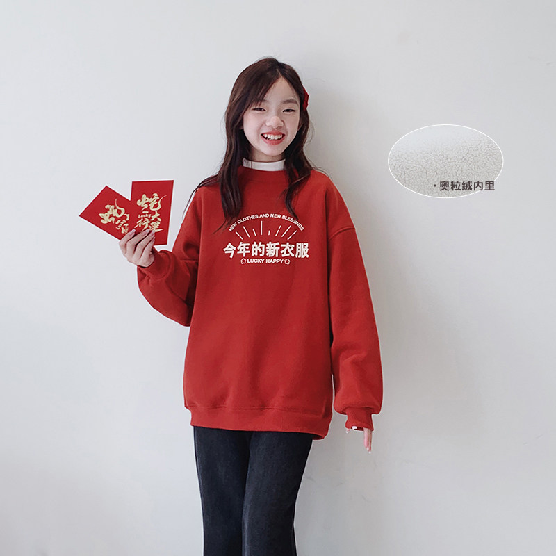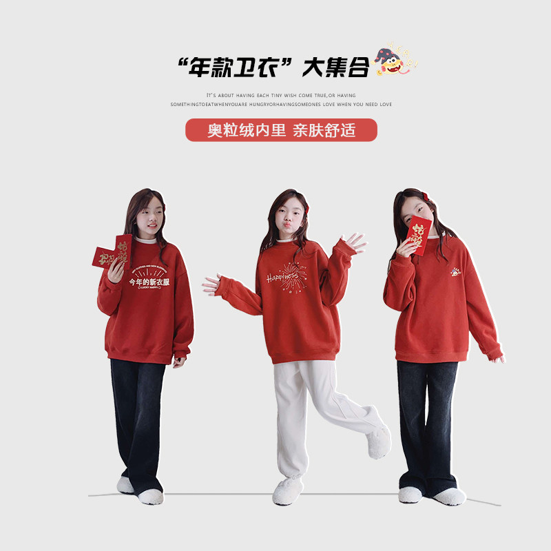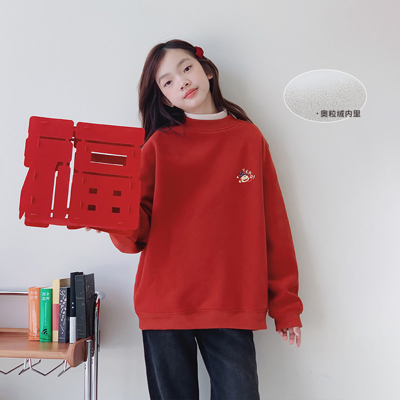 女童加绒卫衣2024冬装新款女大童初中生加厚年款儿童长袖套头上衣