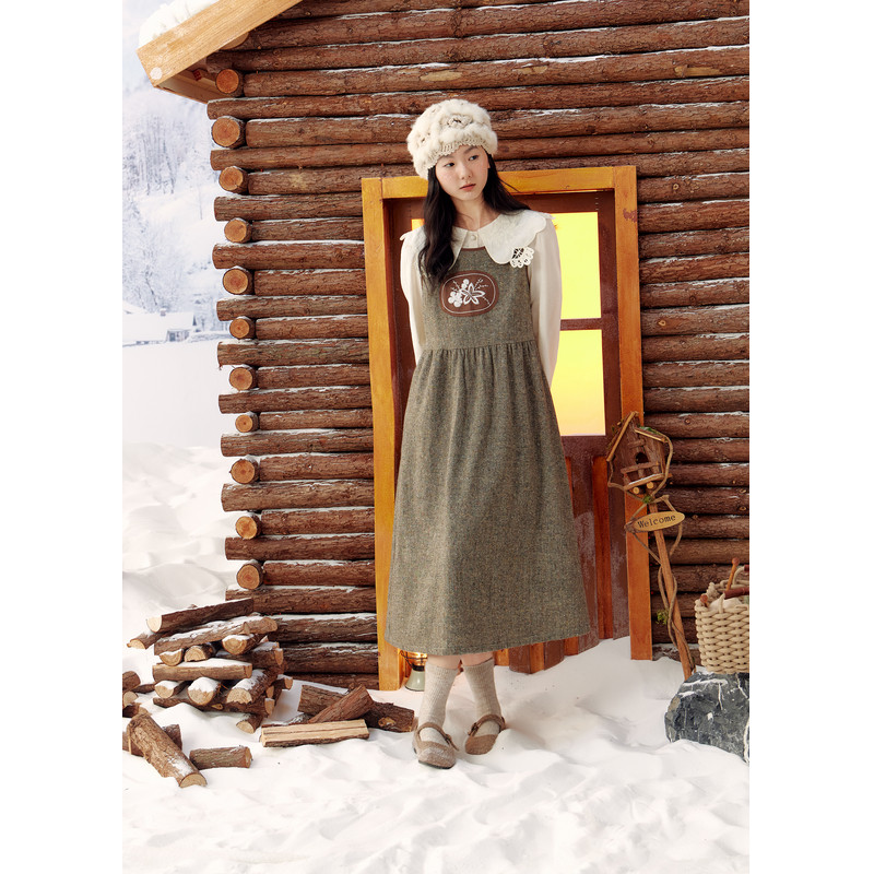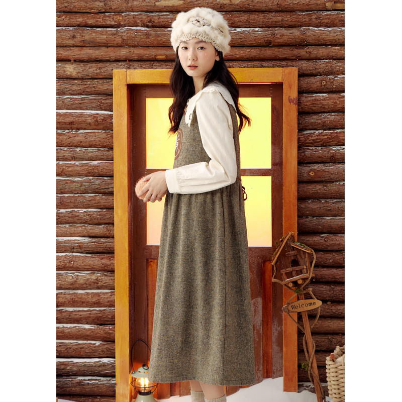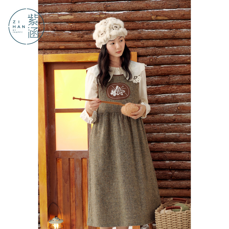 紫涵羊毛背心连衣裙女冬季新款复古宽松撞色贴布中长款a字裙子