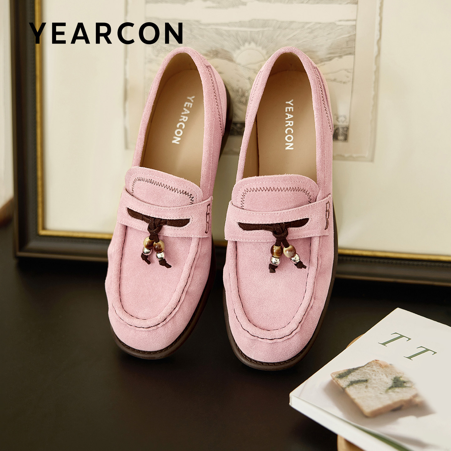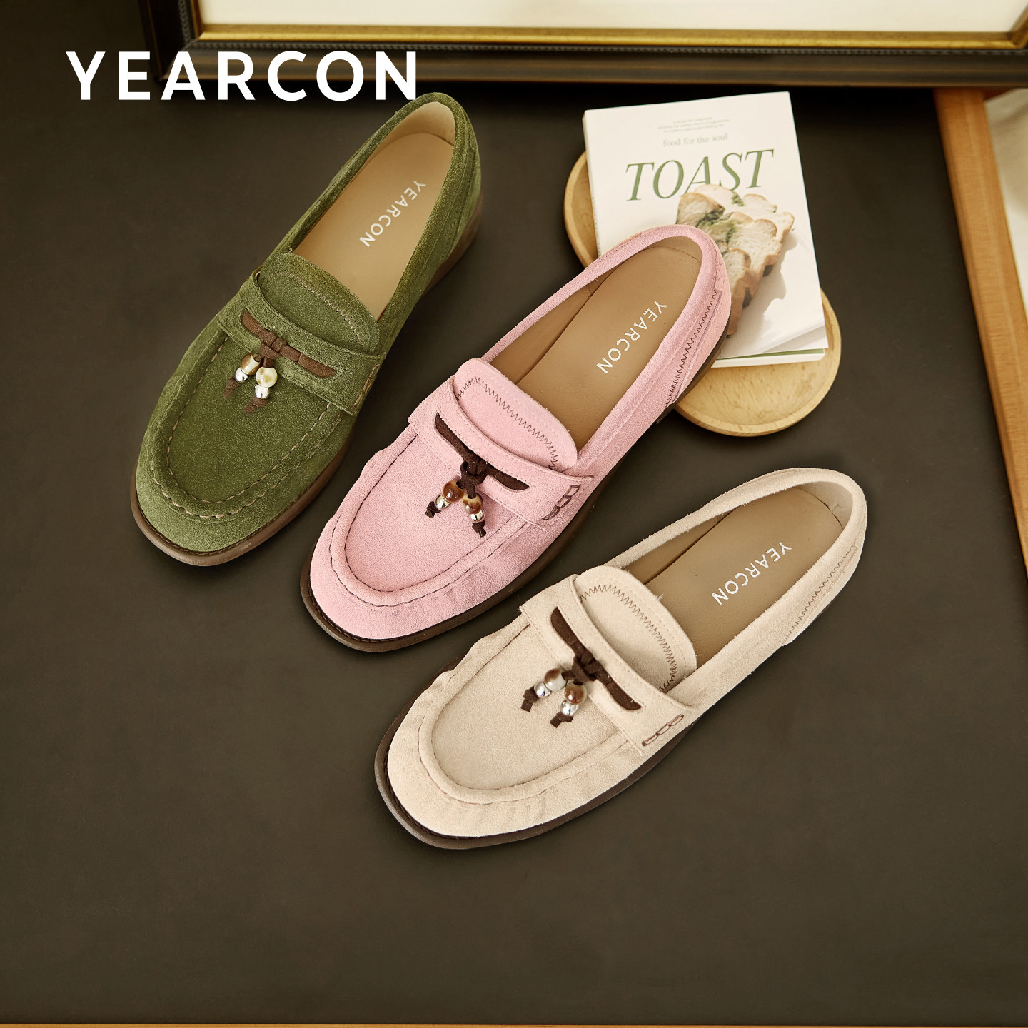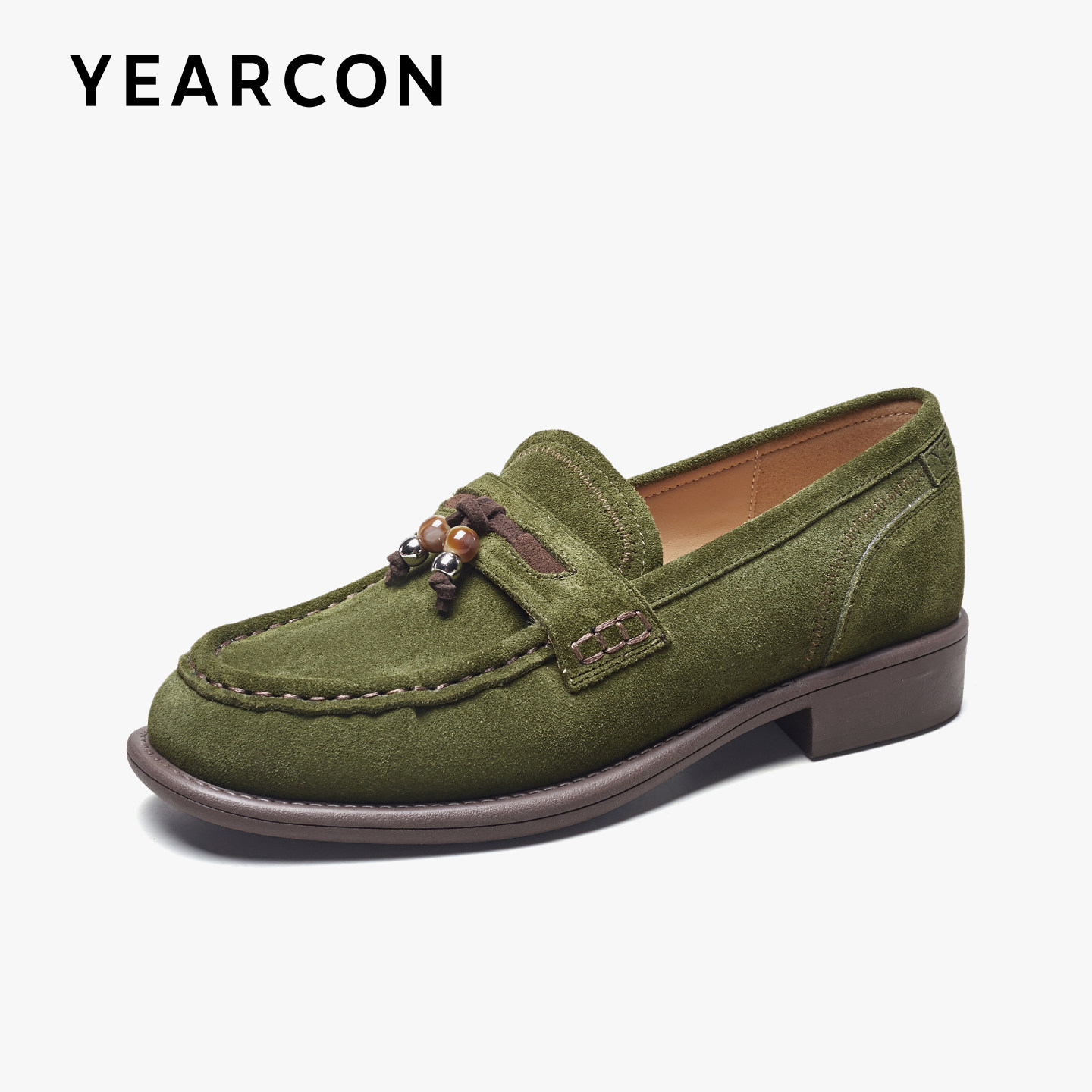 意尔康老钱风真皮乐福鞋女2026春季新款圆头粗跟绒面一脚蹬小皮鞋