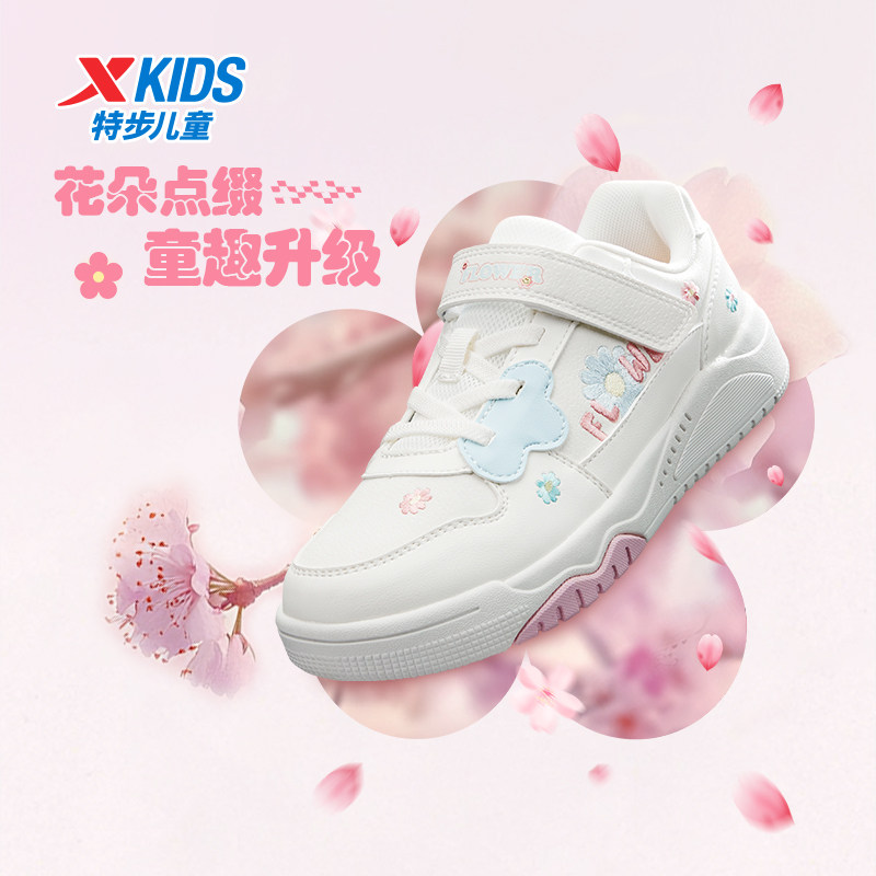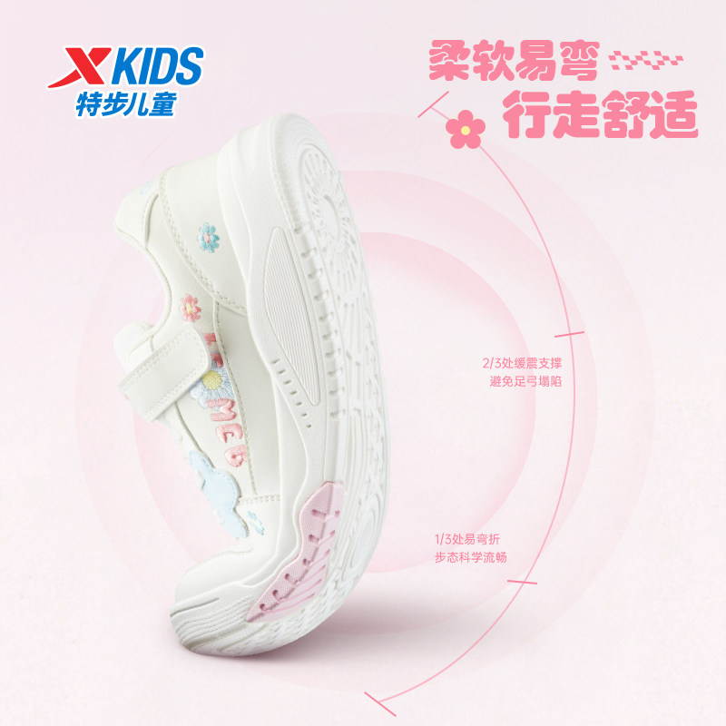 特步童鞋儿童板鞋春秋新款女童鞋子透气革面滑板鞋女孩小童小白鞋