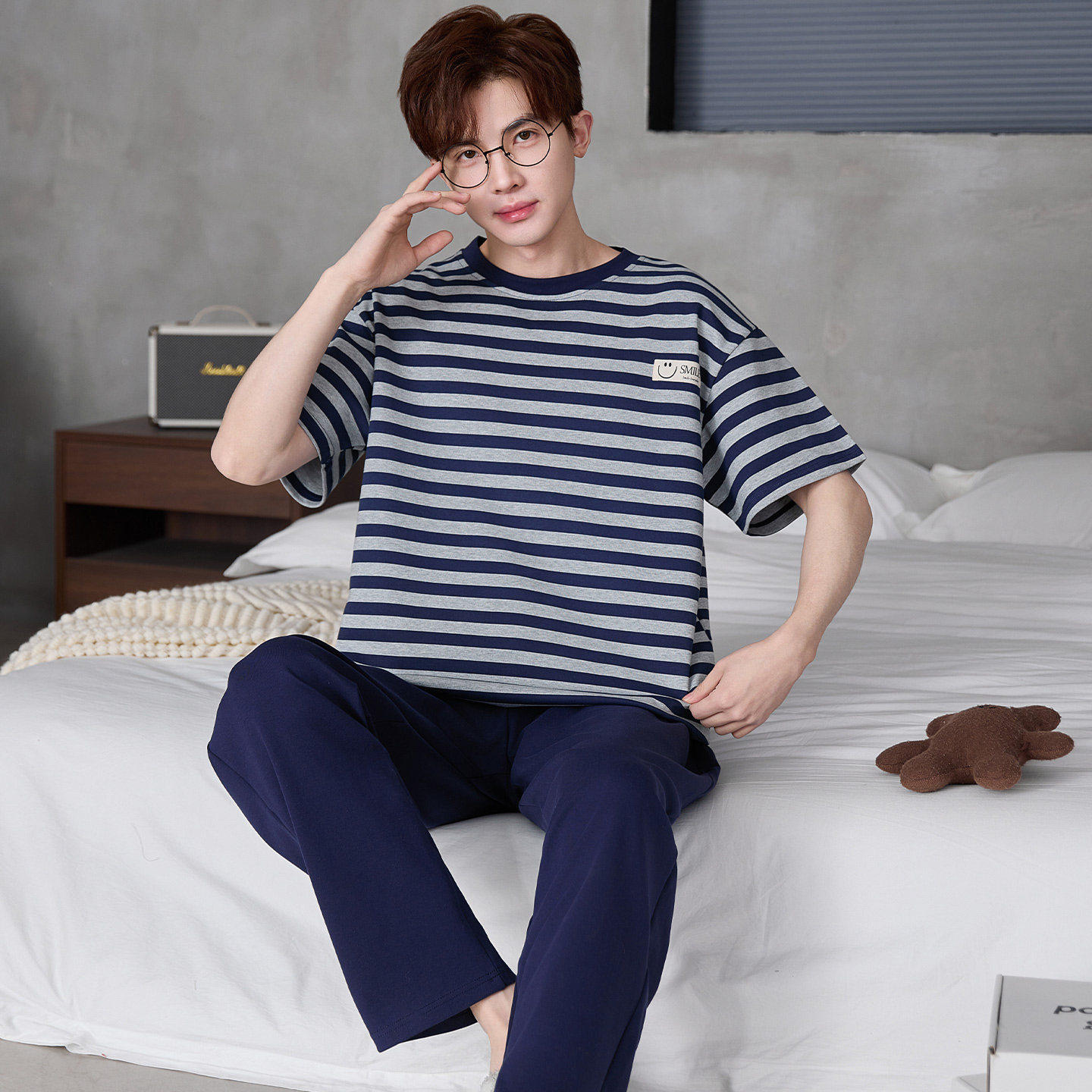 男款2026新款睡衣短袖长裤大童高级感条纹纯棉男孩青少年学生夏季