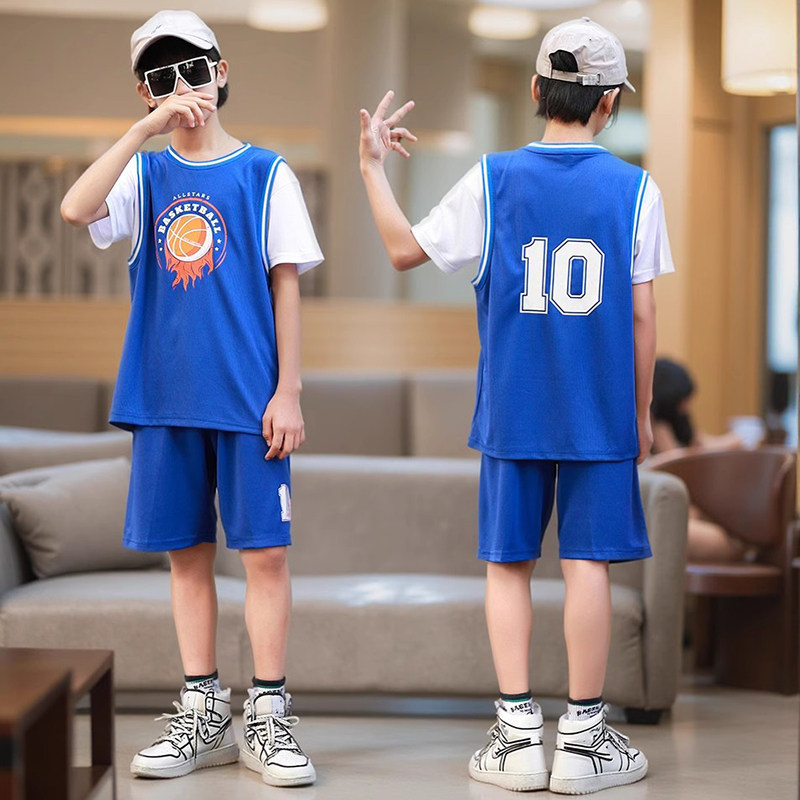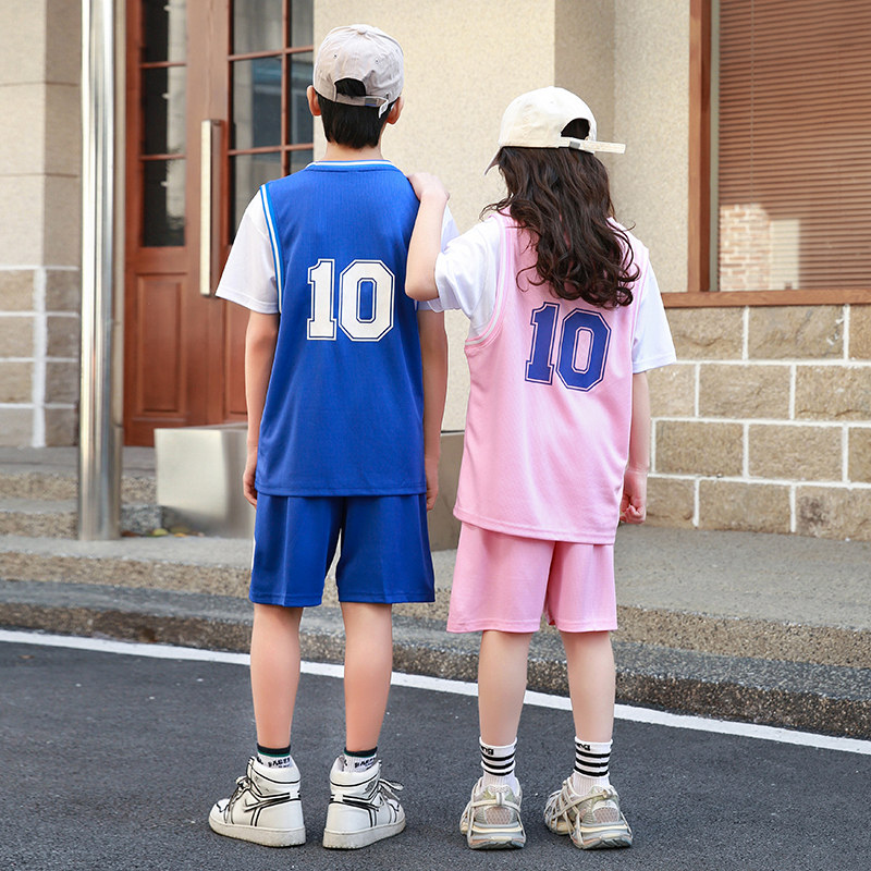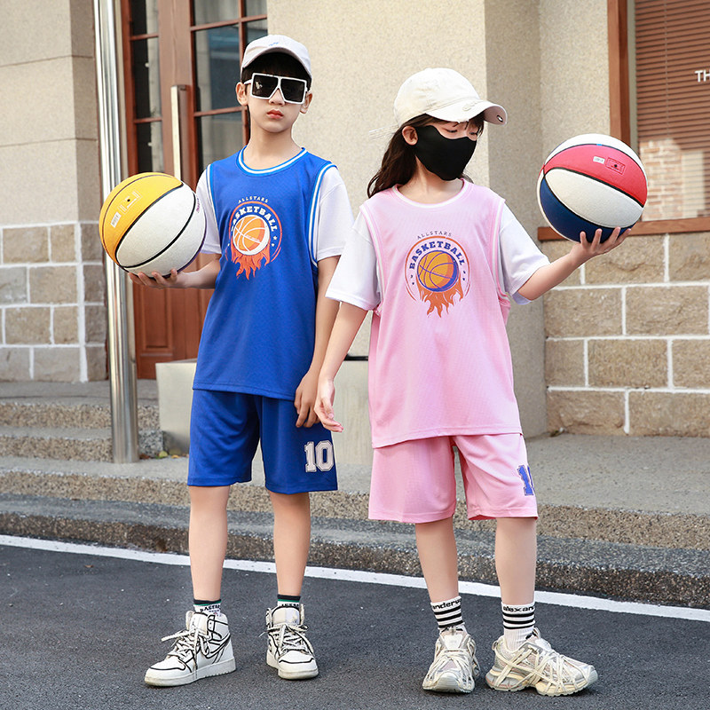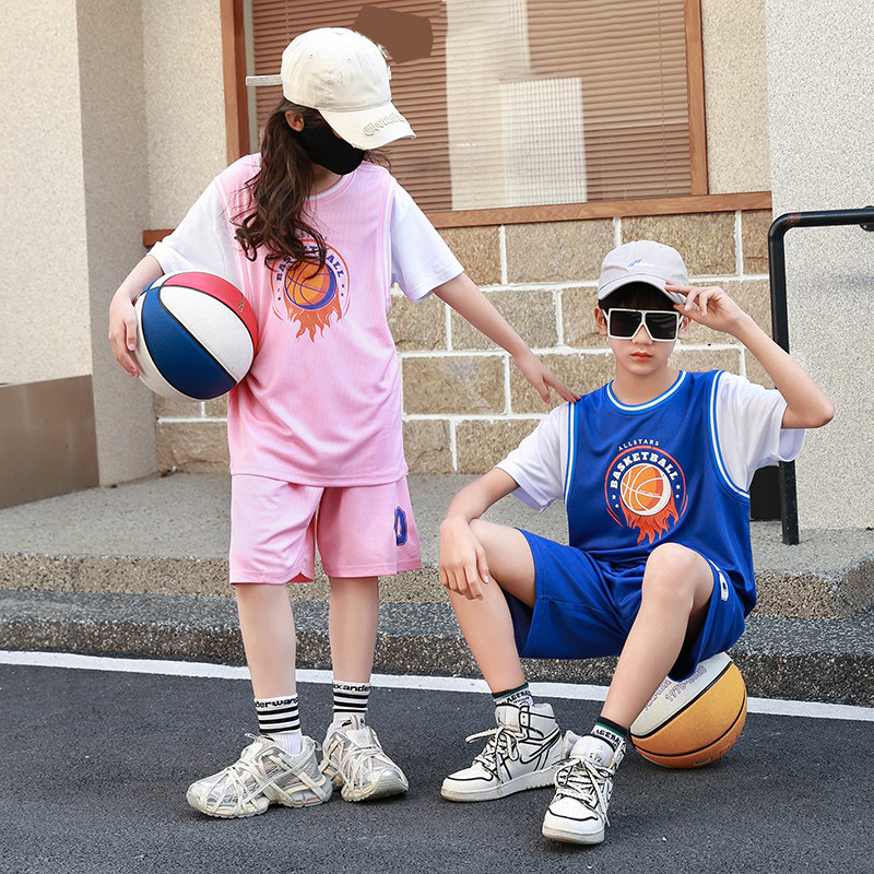 女童粉色假两件短袖篮球服套装女孩夏季运动训练服小童10号蓝球衣