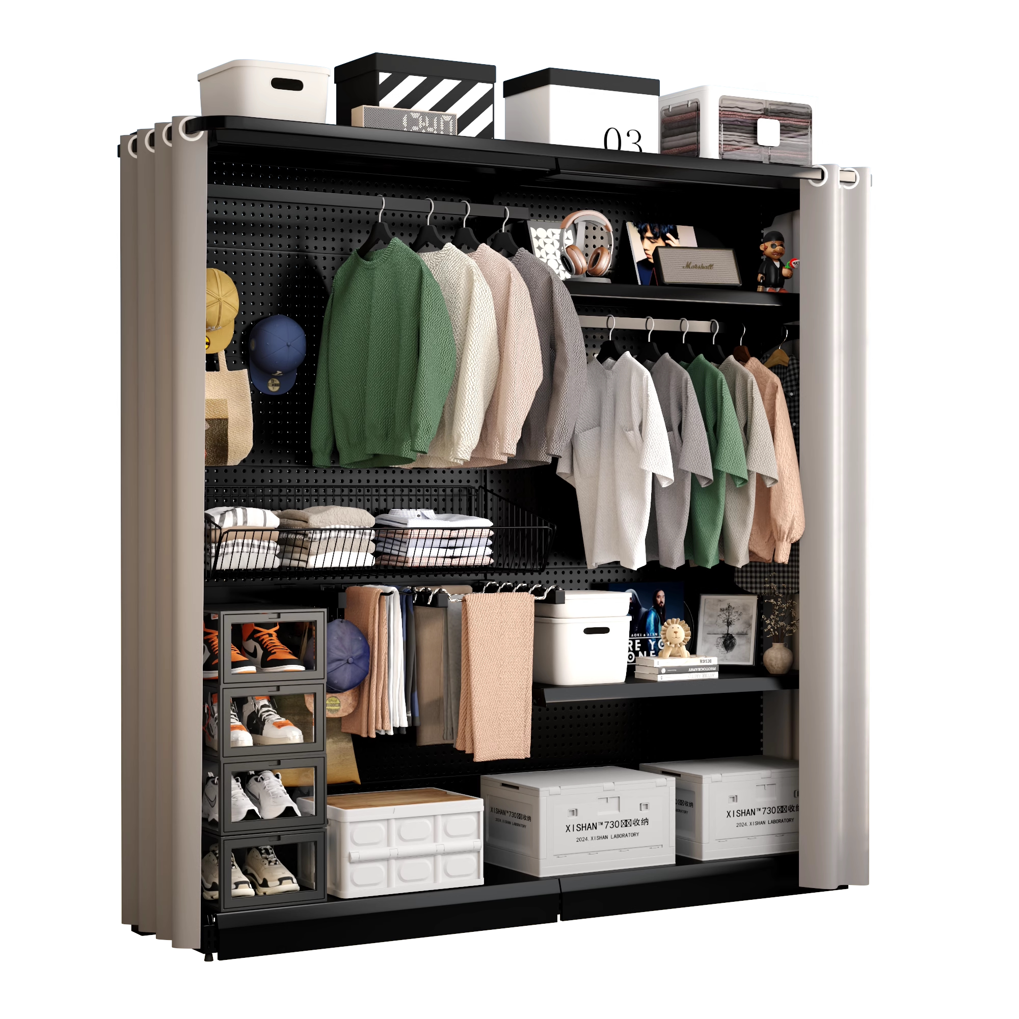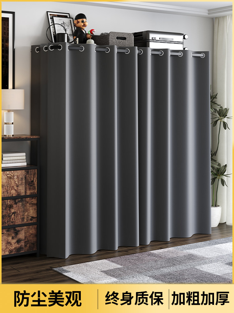 洞洞板简易组装五金衣柜金属衣橱开放式带防尘帘出租房少女衣帽间