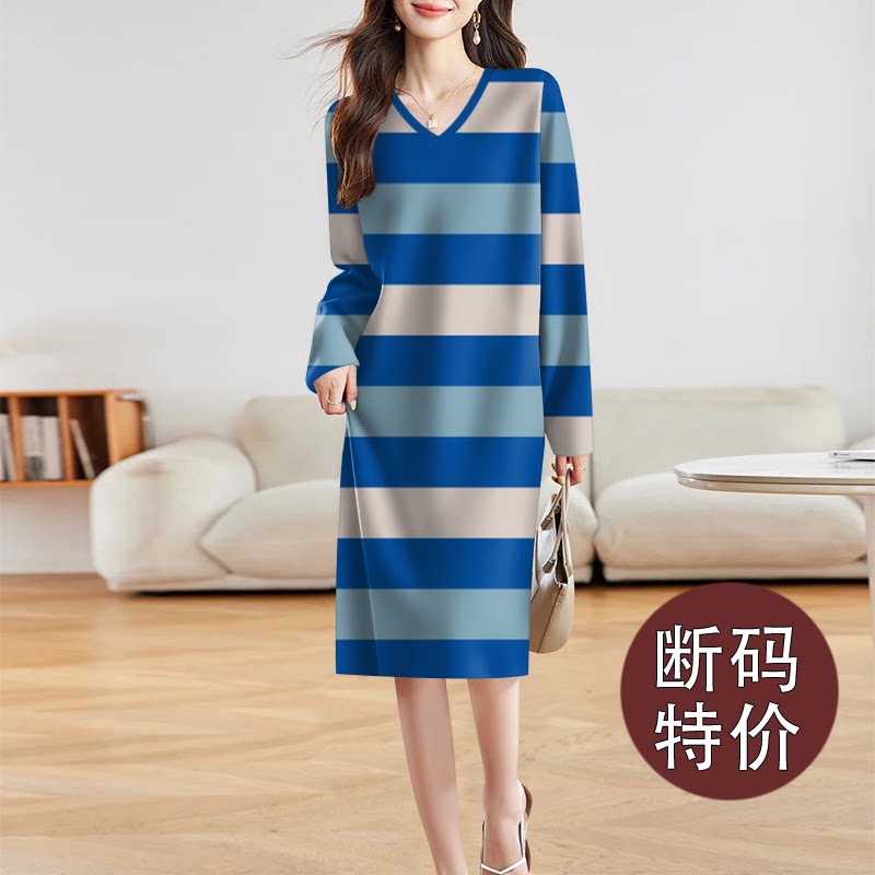 2026秋冬新款高端低圆领条纹连衣裙女宽松显瘦中长款百搭打底裙子