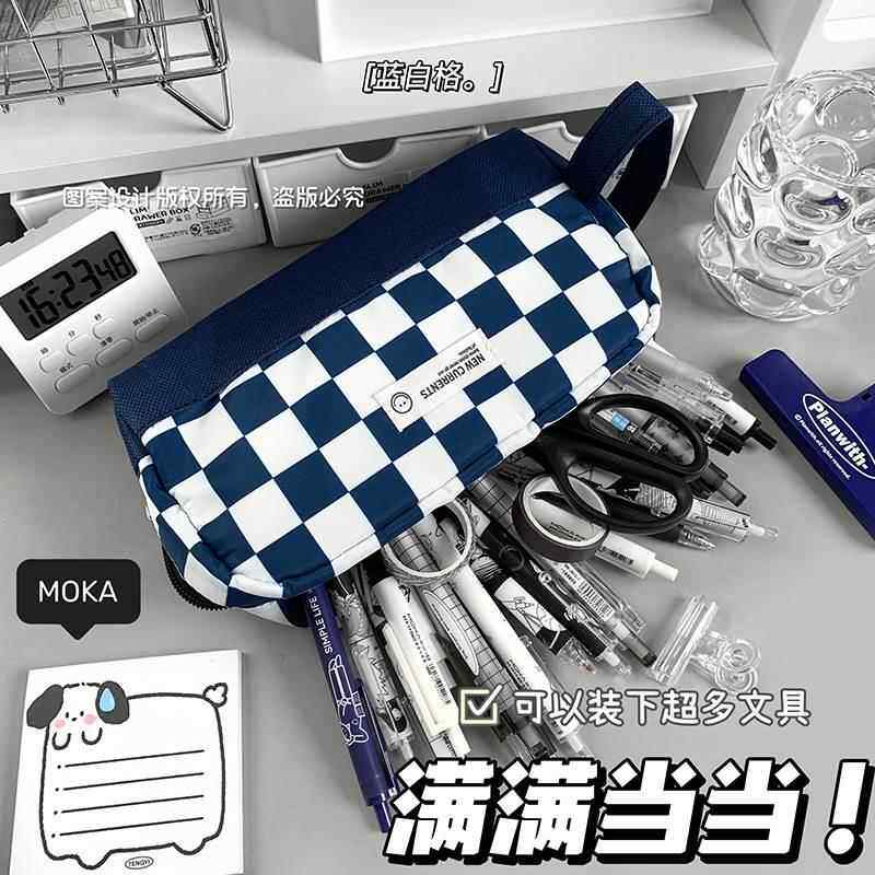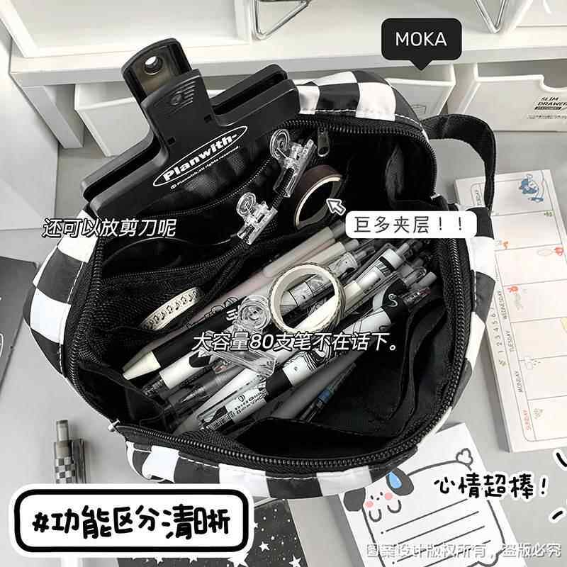 黑白棋盘格笔袋女生初中学生大容量简约手提韩版ins风高颜值黑白格耐脏文具包文具袋学生小众铅笔盒铅笔袋