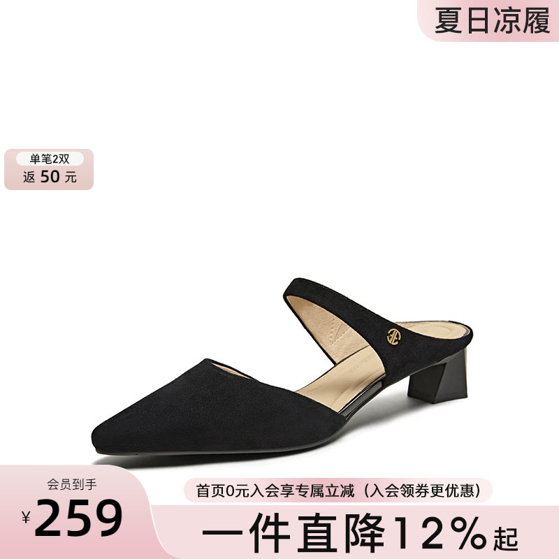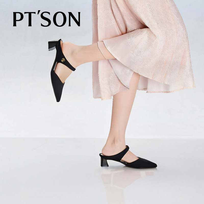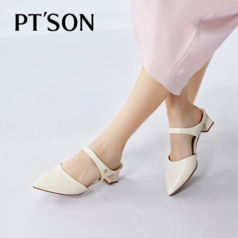 百田森真皮穆勒鞋女凉拖鞋女夏外穿新款高级感粗跟包头尖头鞋