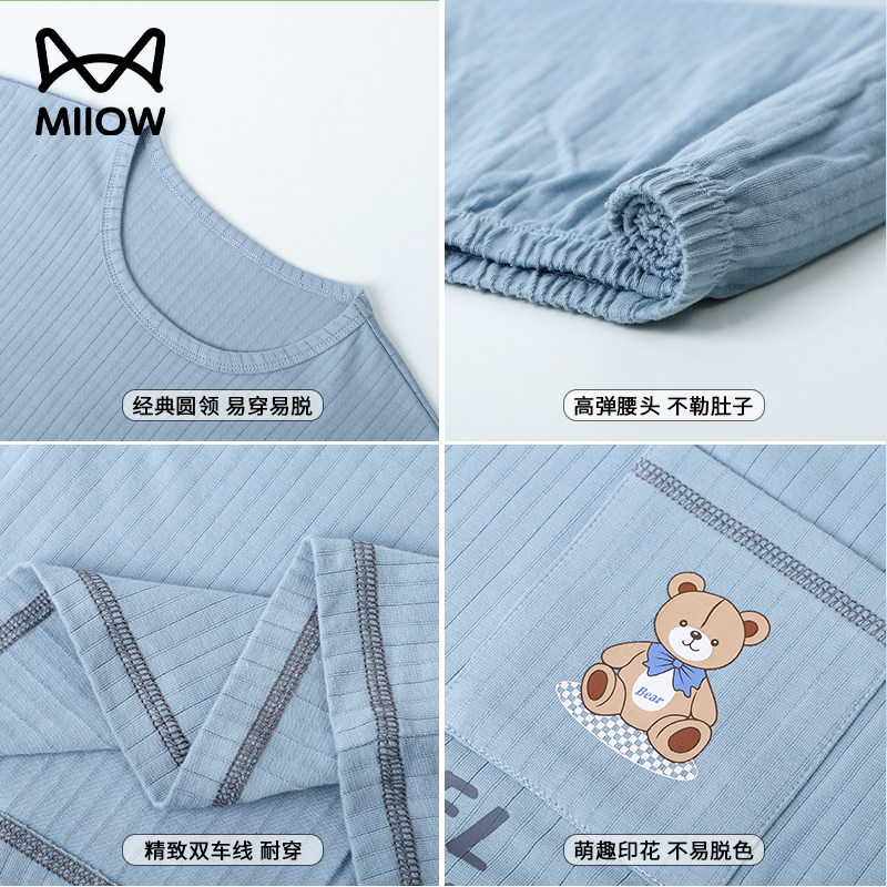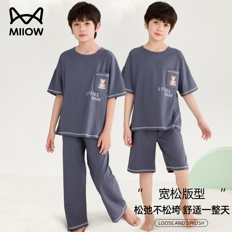猫人男童睡衣a类纯棉儿童家居服空调服三件套装男孩大童青少年夏