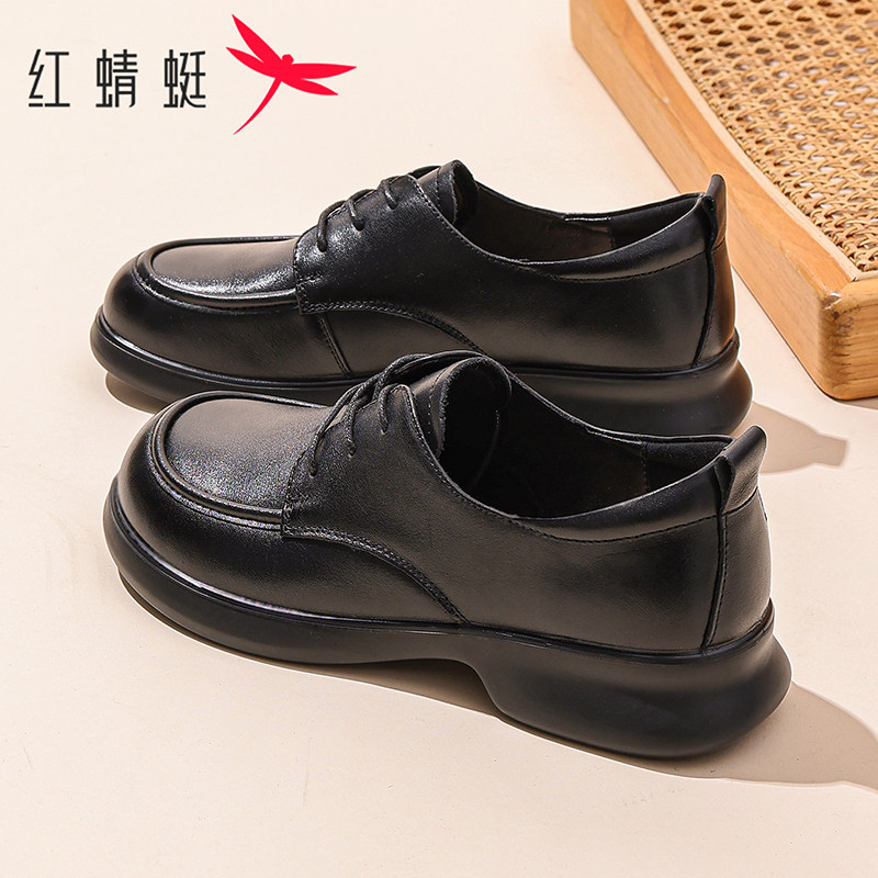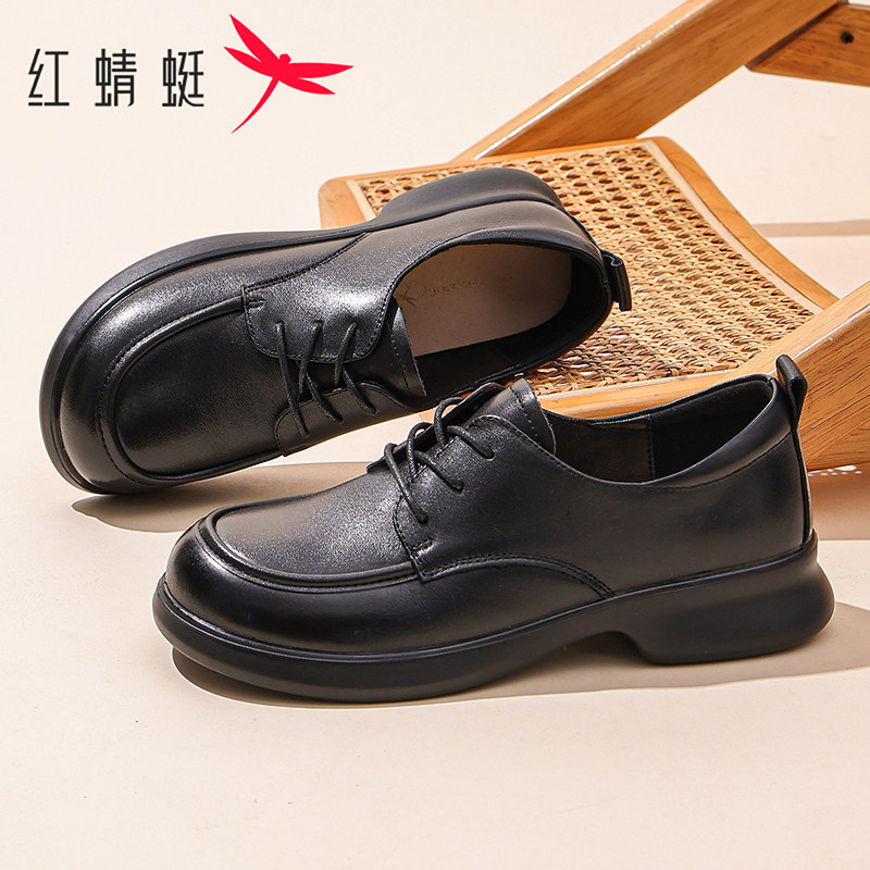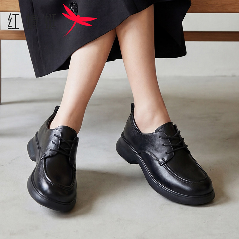 红蜻蜓女鞋2026春季新款复古真皮厚底小皮鞋乐福鞋英伦风系带单鞋
