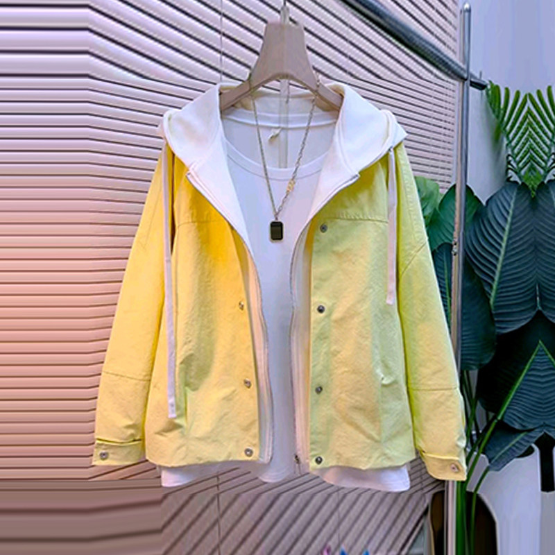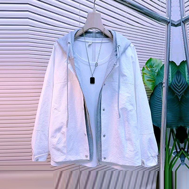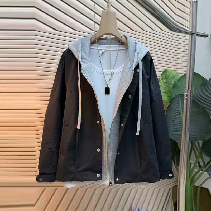 加肥女拼色连帽长袖外套2026早春新款韩版简约胖妹妹百搭休闲上衣