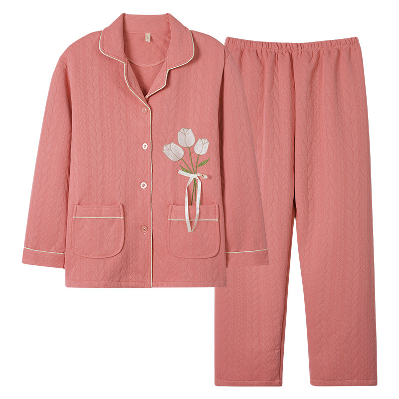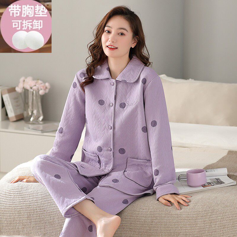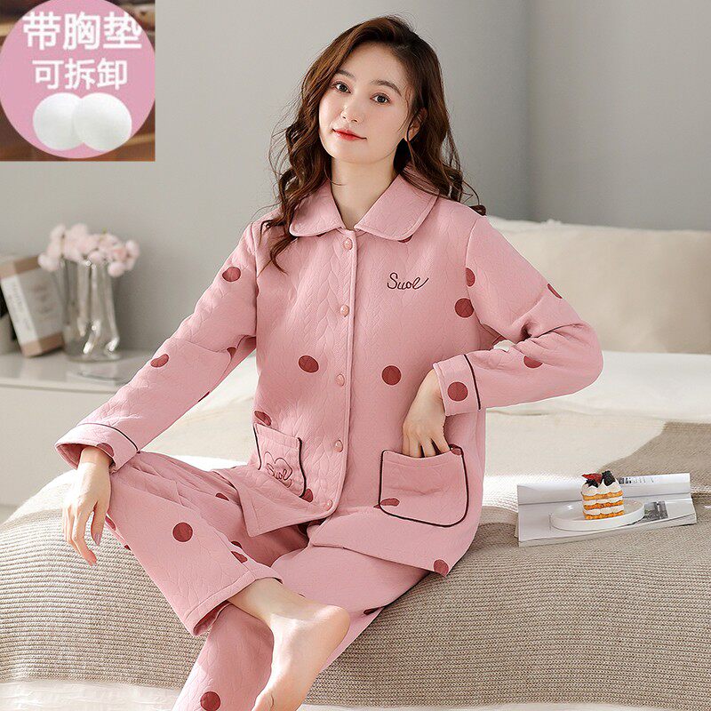 带胸垫夹层中年人加厚纯棉睡衣女长袖秋冬季薄夹棉空气棉妈妈套装
