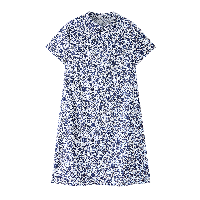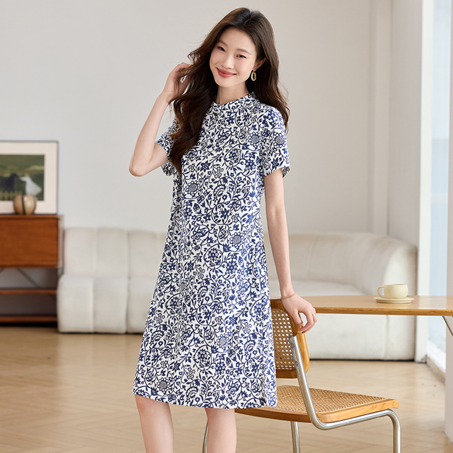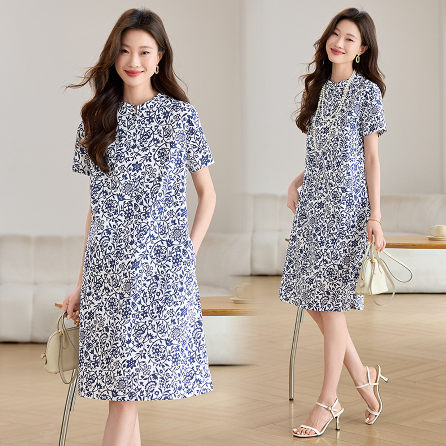 新中式改良旗袍连衣裙短袖高级感小个子纯棉妈妈蓝色碎花裙子女夏