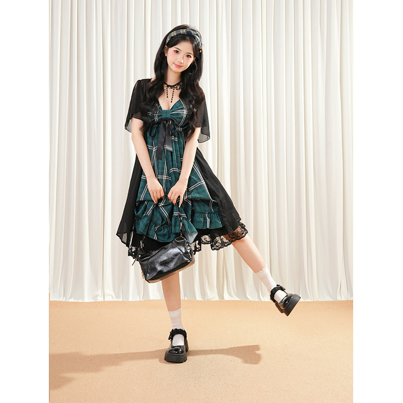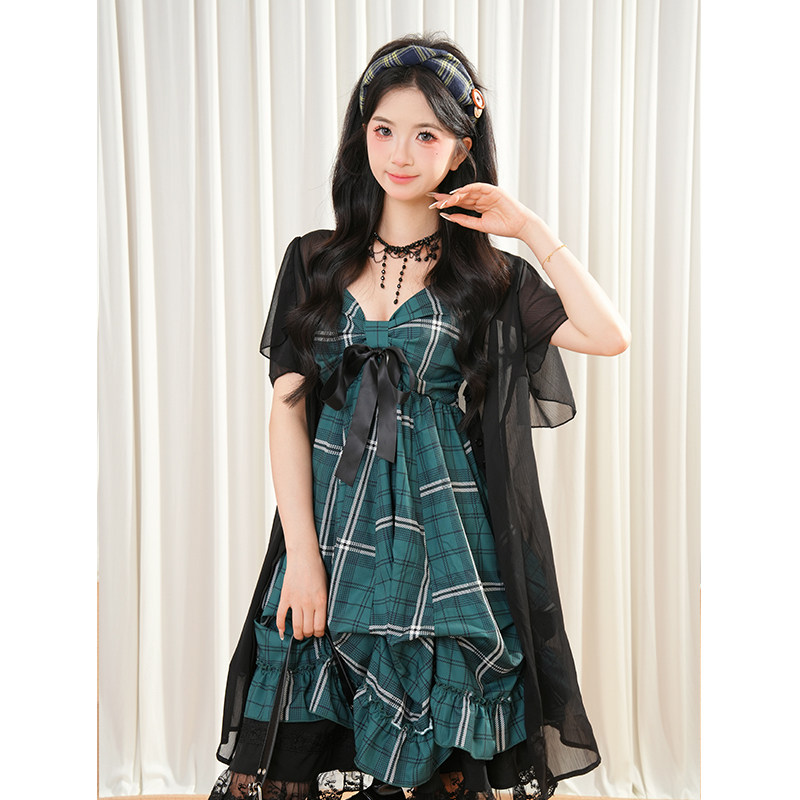 复古设计感小众短款开衫绿色格子吊带连衣裙蕾丝拼接半裙三件套女