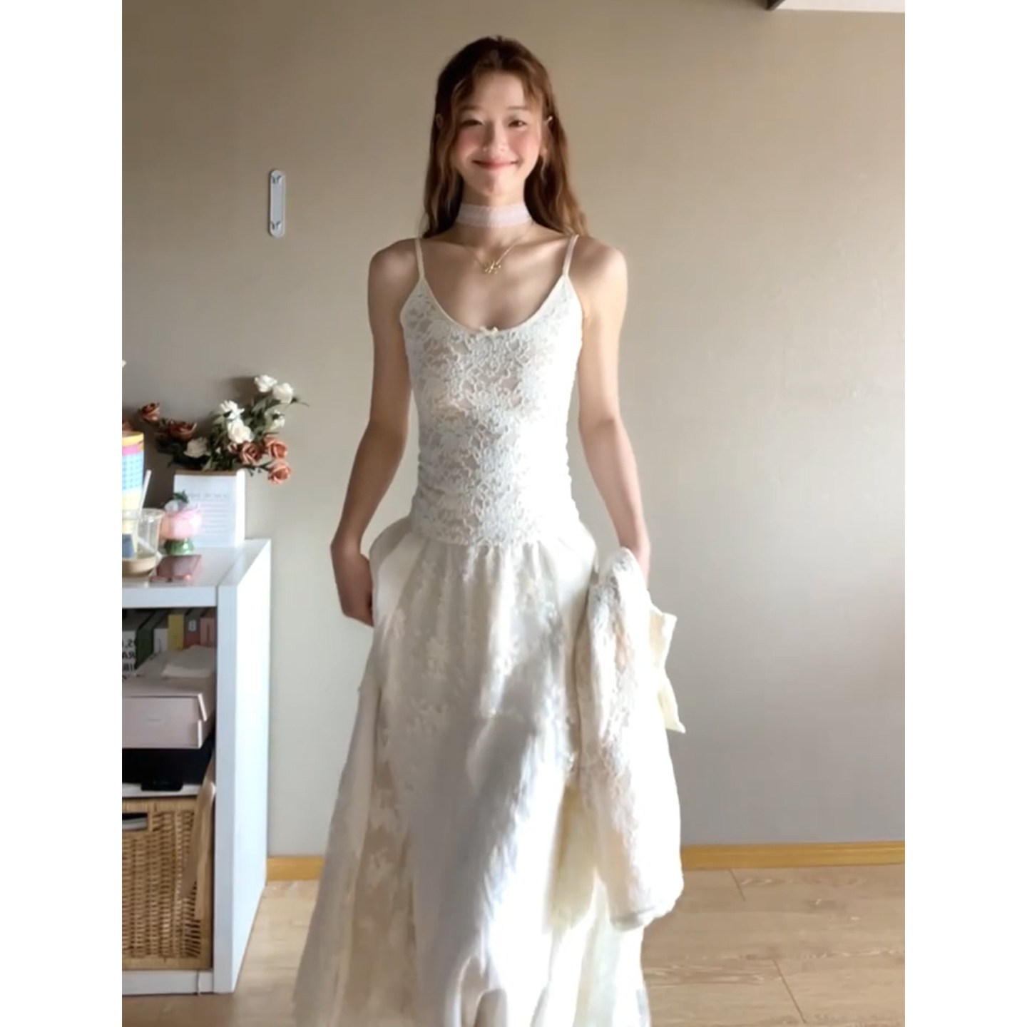 巨好看韩系一整套ootd穿搭蕾丝拼接白色连衣裙子套装2026新款春季
