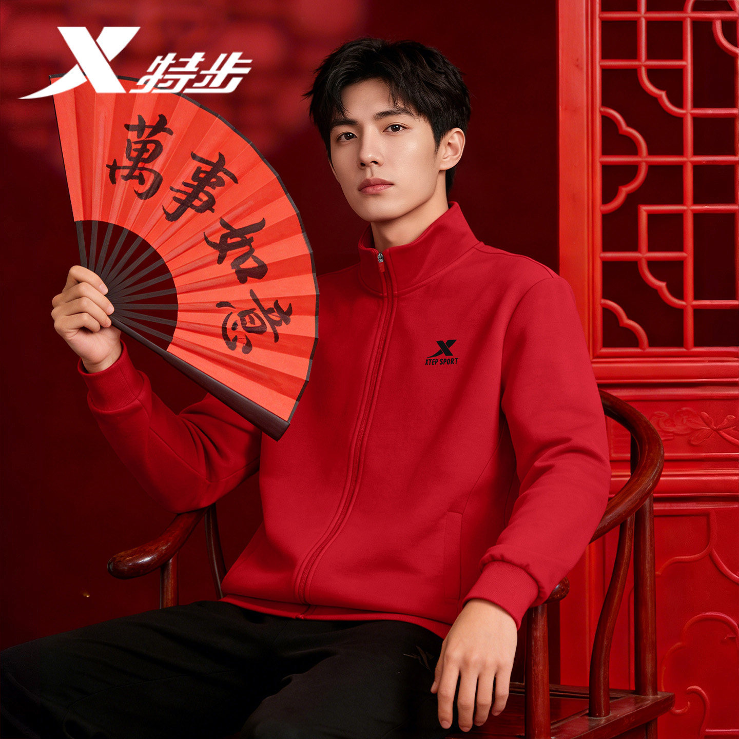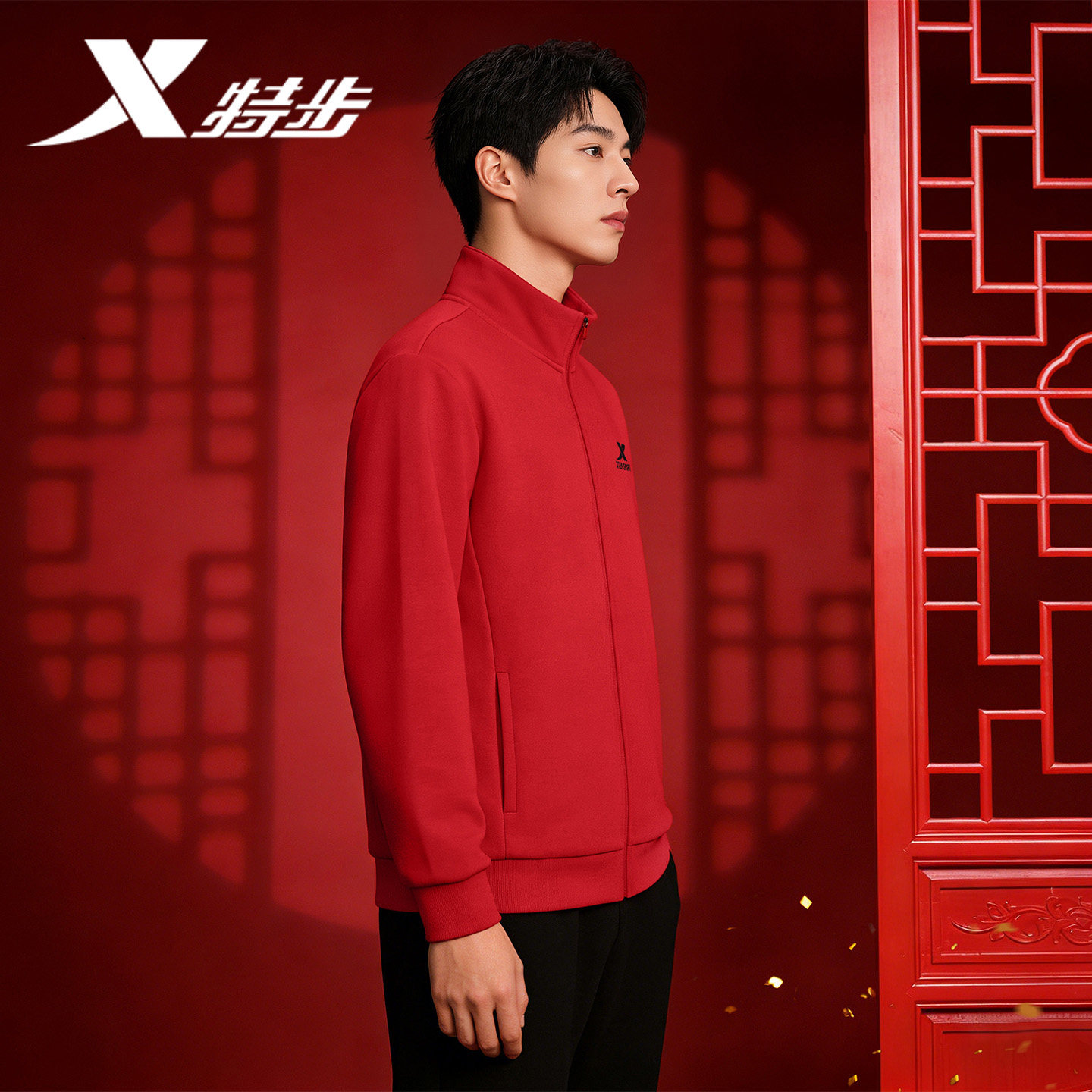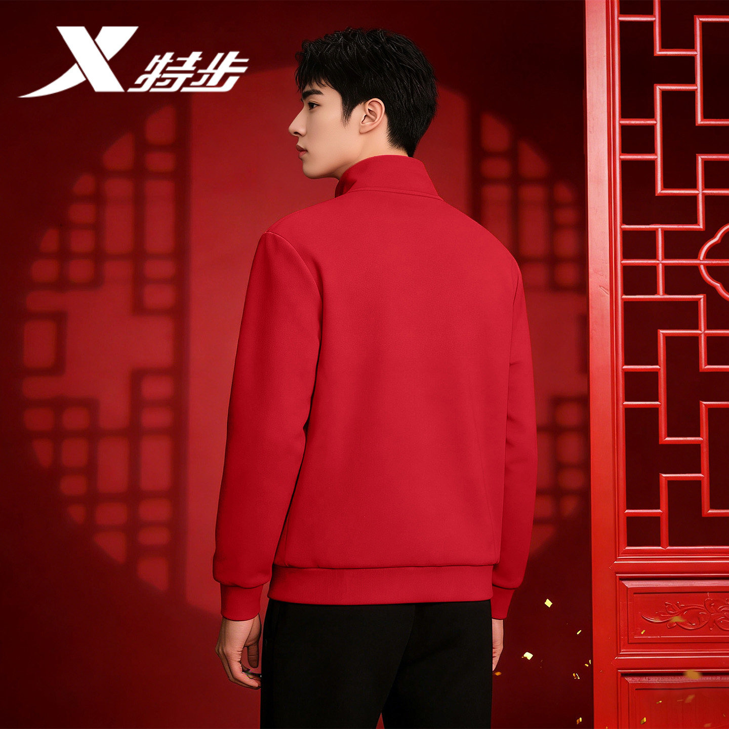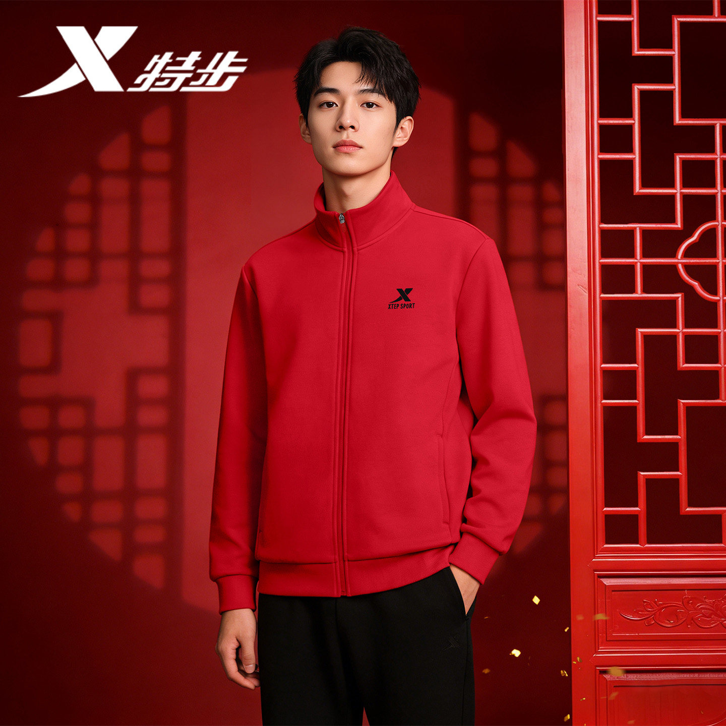 特步加绒运动外套男冬季官方正品运动服红色开衫休闲针织上衣男款