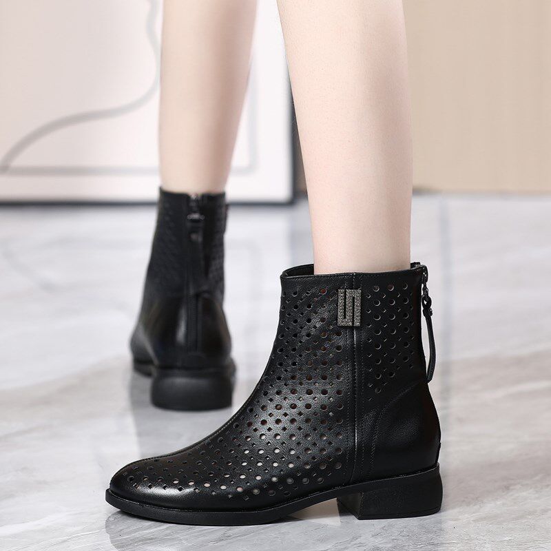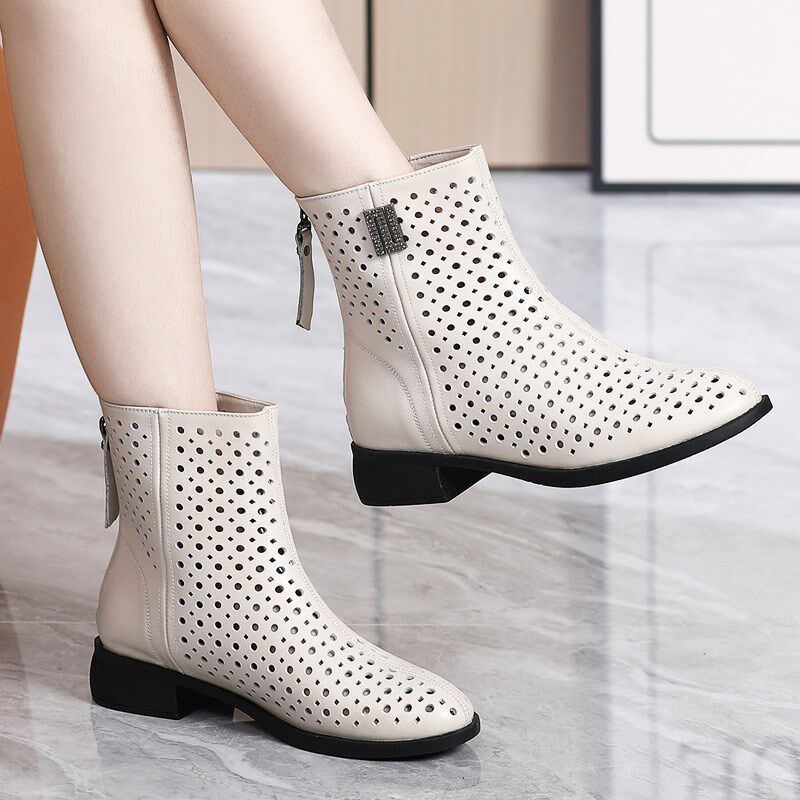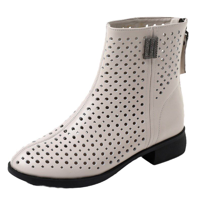 头层牛皮真皮女鞋镂空短靴女春秋单靴白色春夏季凉靴子软底洞洞鞋