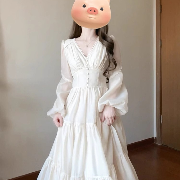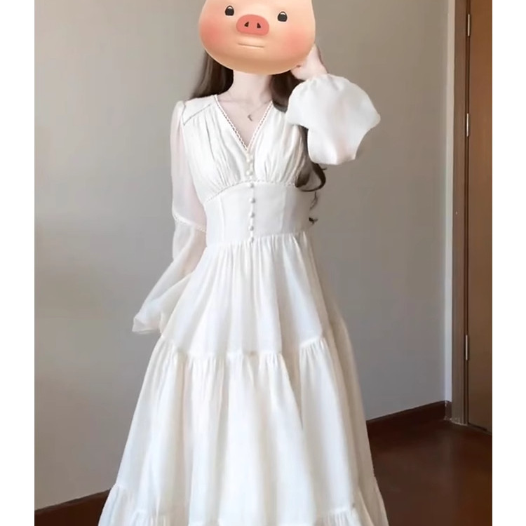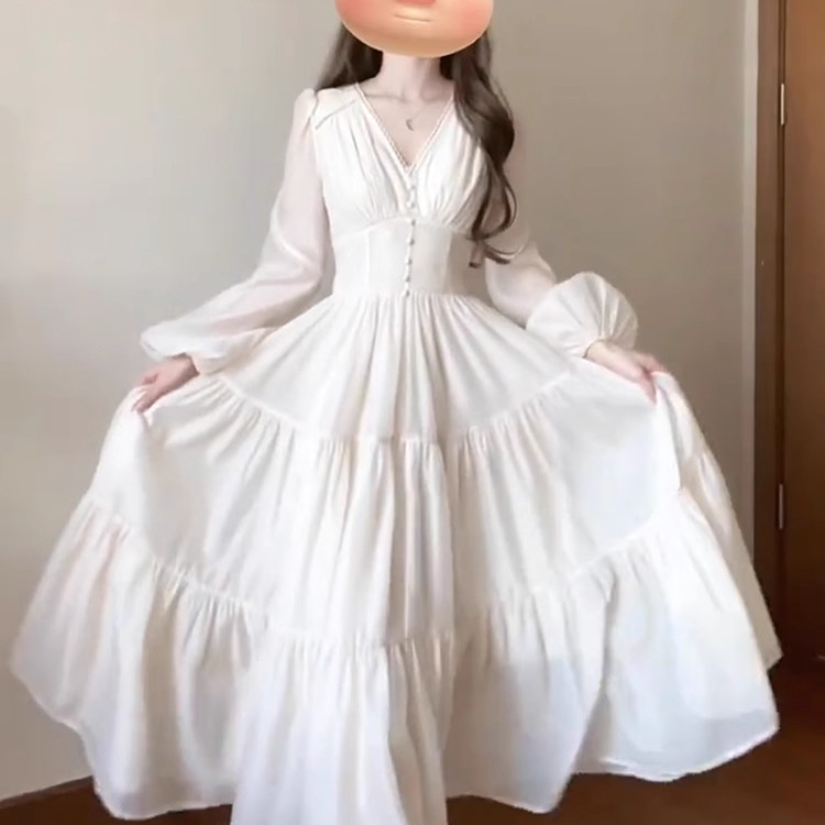 夏季优雅度假大码女装法式V领白色连衣裙温柔仙气质收腰显瘦长裙