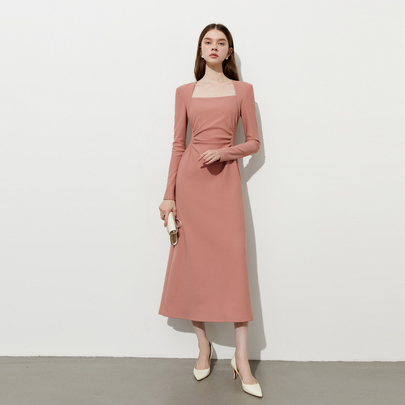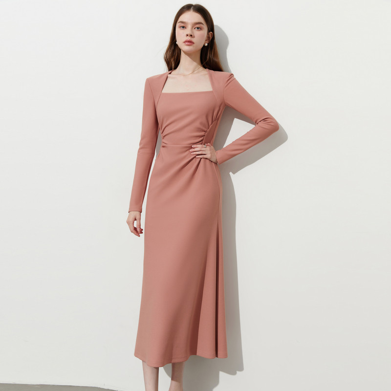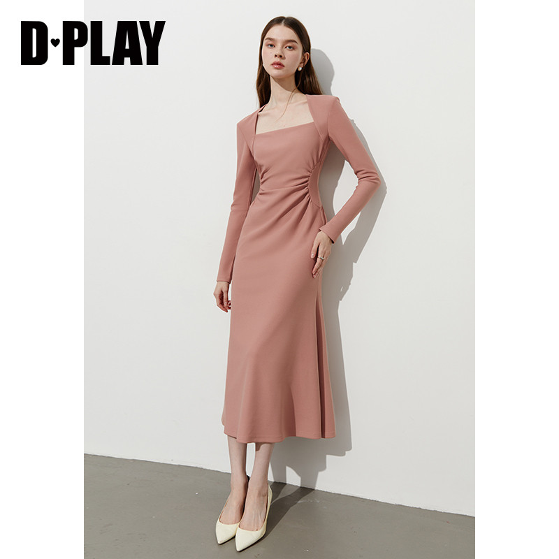 DPLAY年秋季新款粉色连衣裙女法式气质长款礼服裙子长裙长袖