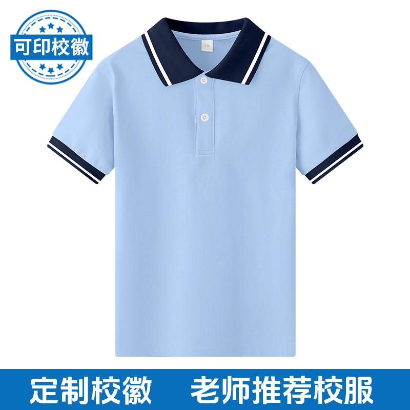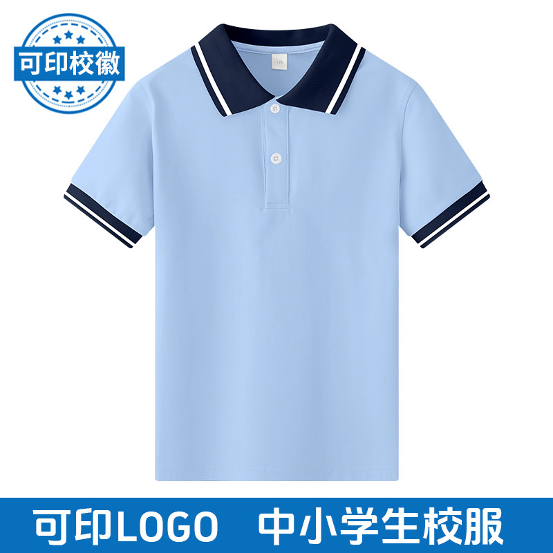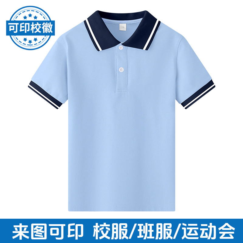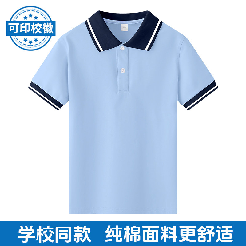 25浅蓝色小学生纯棉短袖t恤儿童Polo衫男童校服夏季班服定做校徽