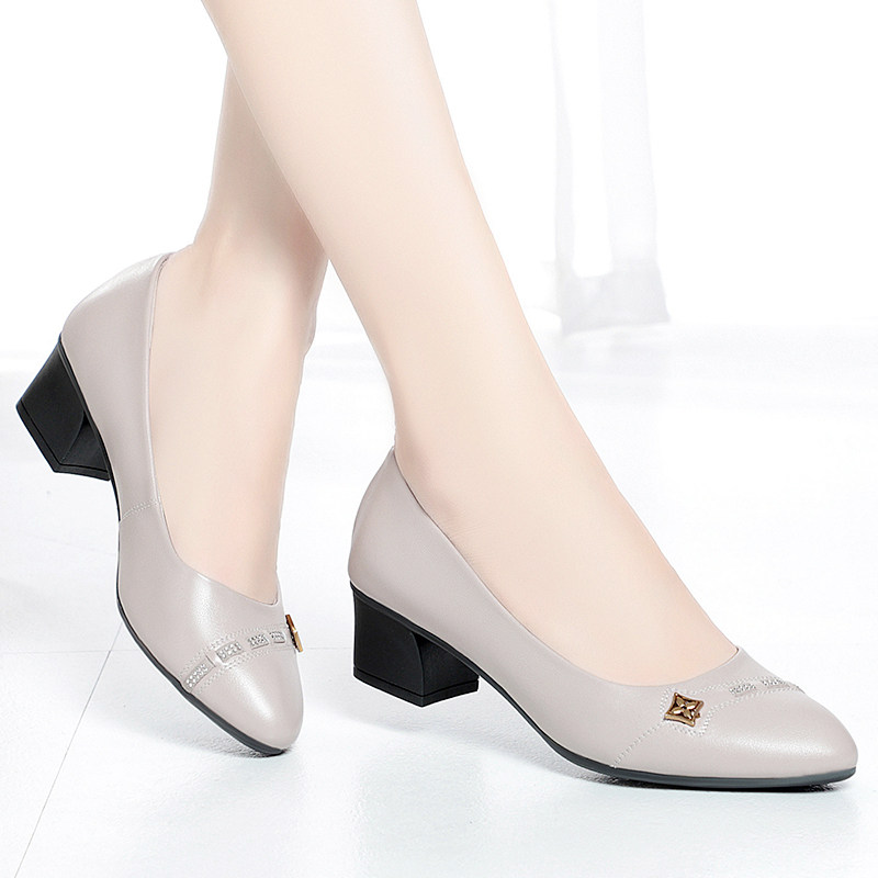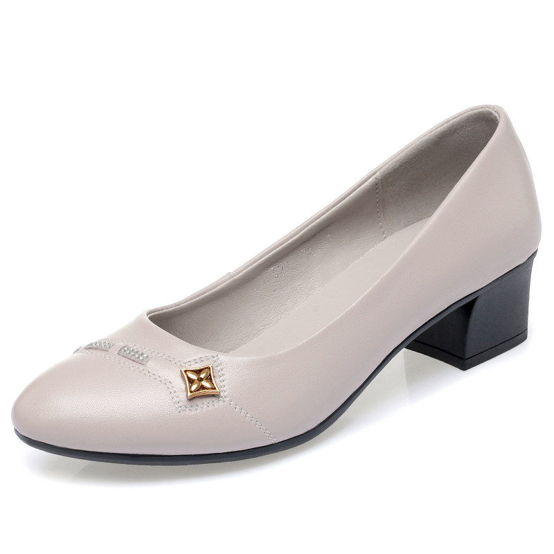 灰色单鞋真皮粗跟中年女士妈妈皮鞋软皮中跟一脚蹬不累脚女鞋软底