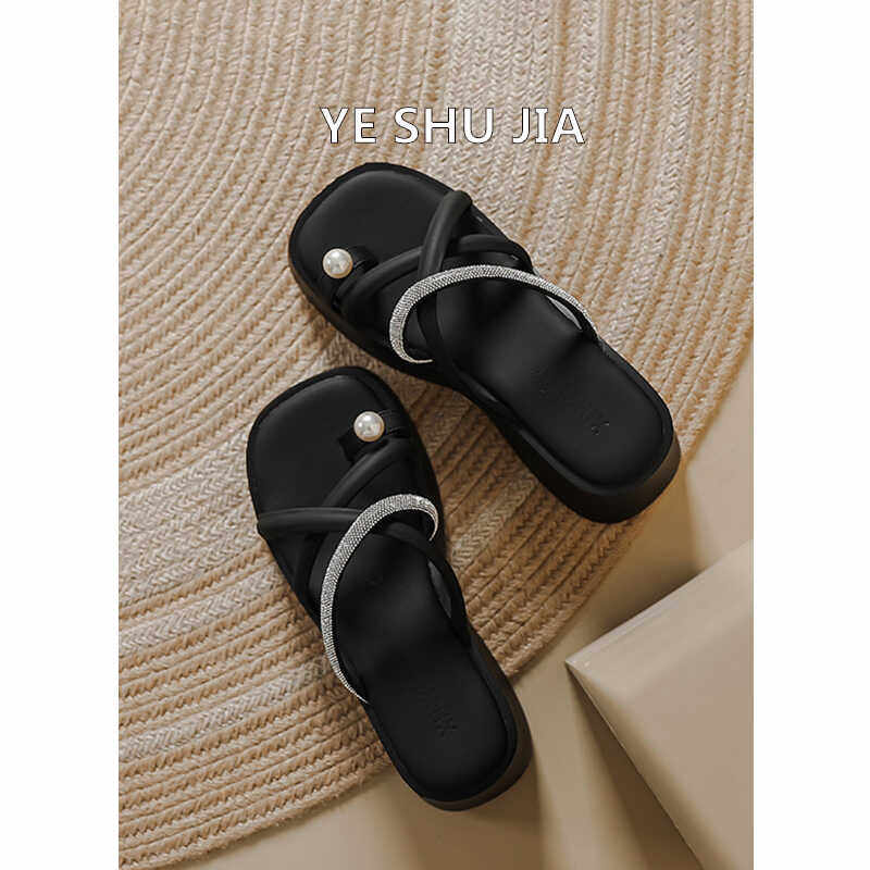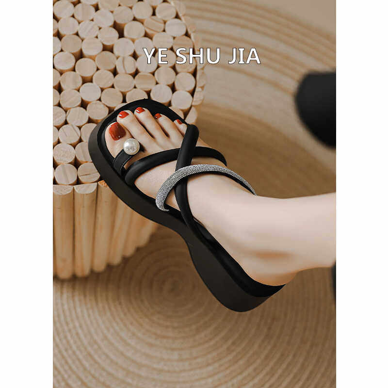 白色夹趾厚底拖鞋女2024新款夏天珍珠水钻增高配裙子小香气质凉拖