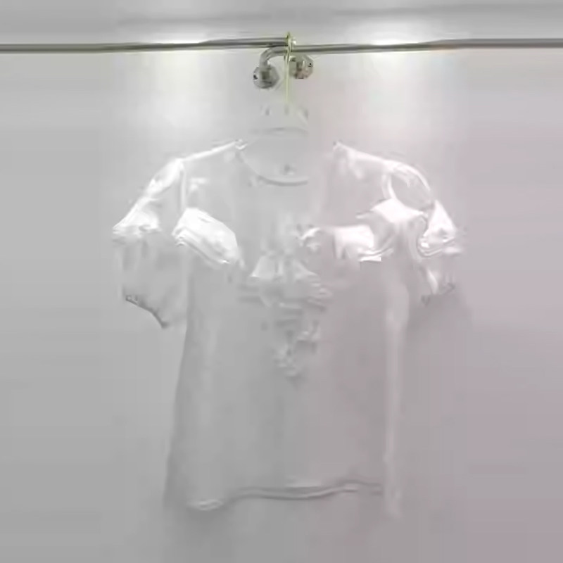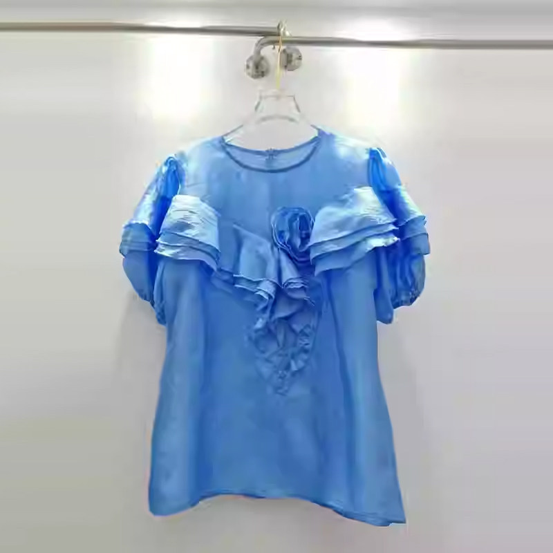 2026年新款夏季重工花朵圆领短袖雪纺衫显瘦亮面拉链直筒套头衬衫