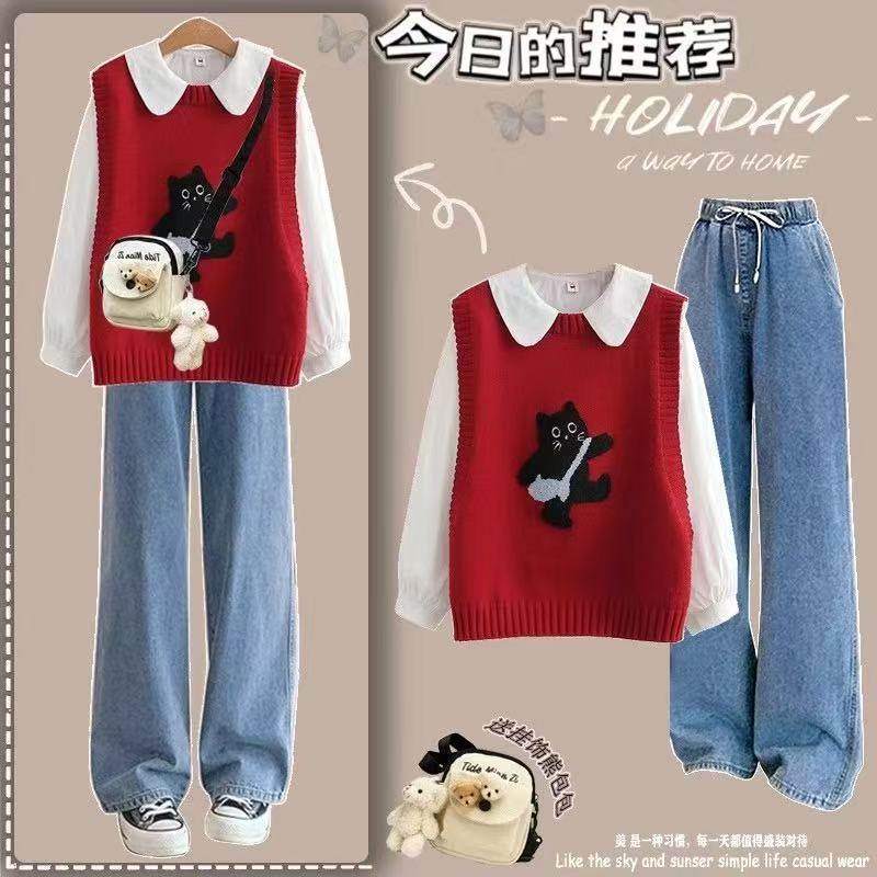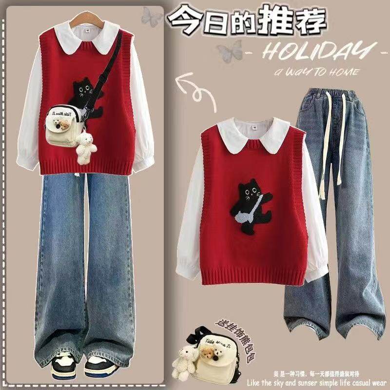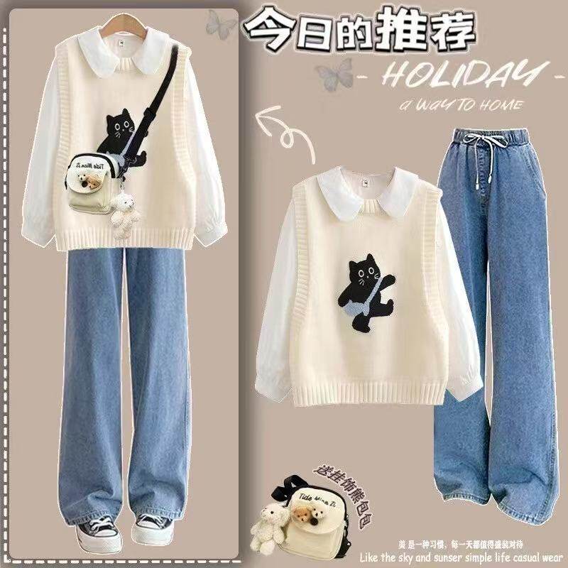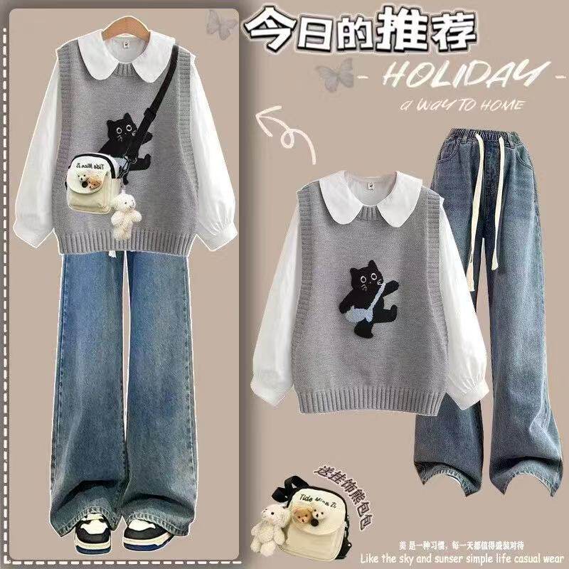 女童春秋2025新款洋气套装时髦针织马甲衬衫初中学生牛仔裤三件套
