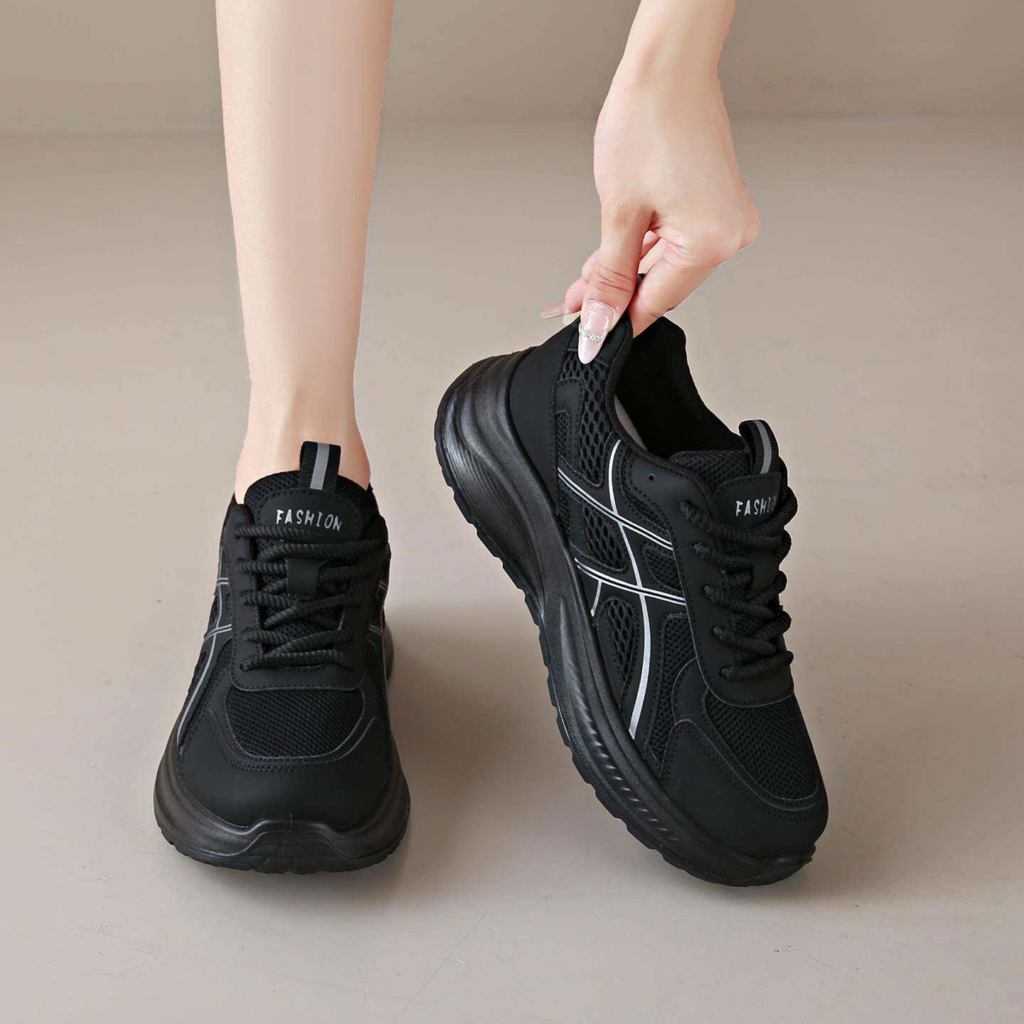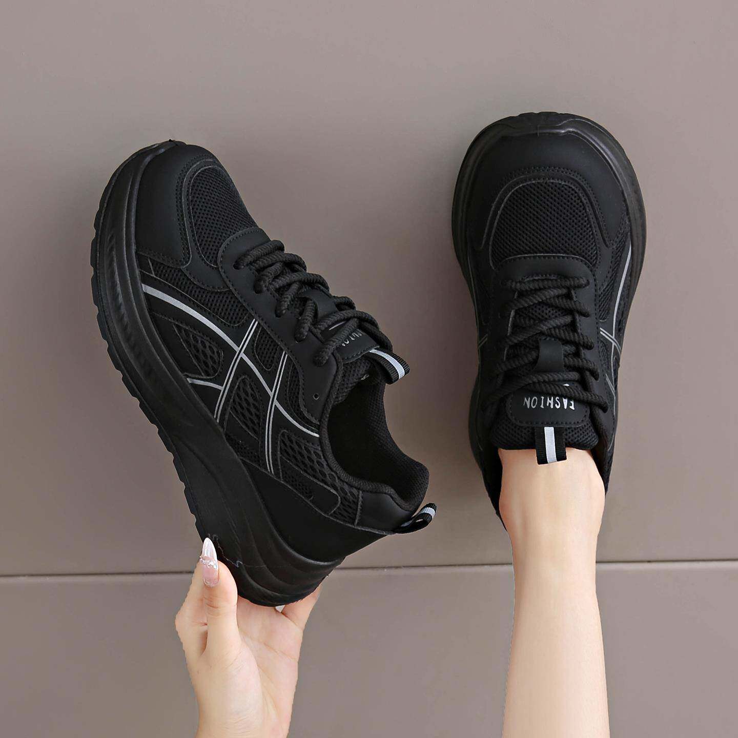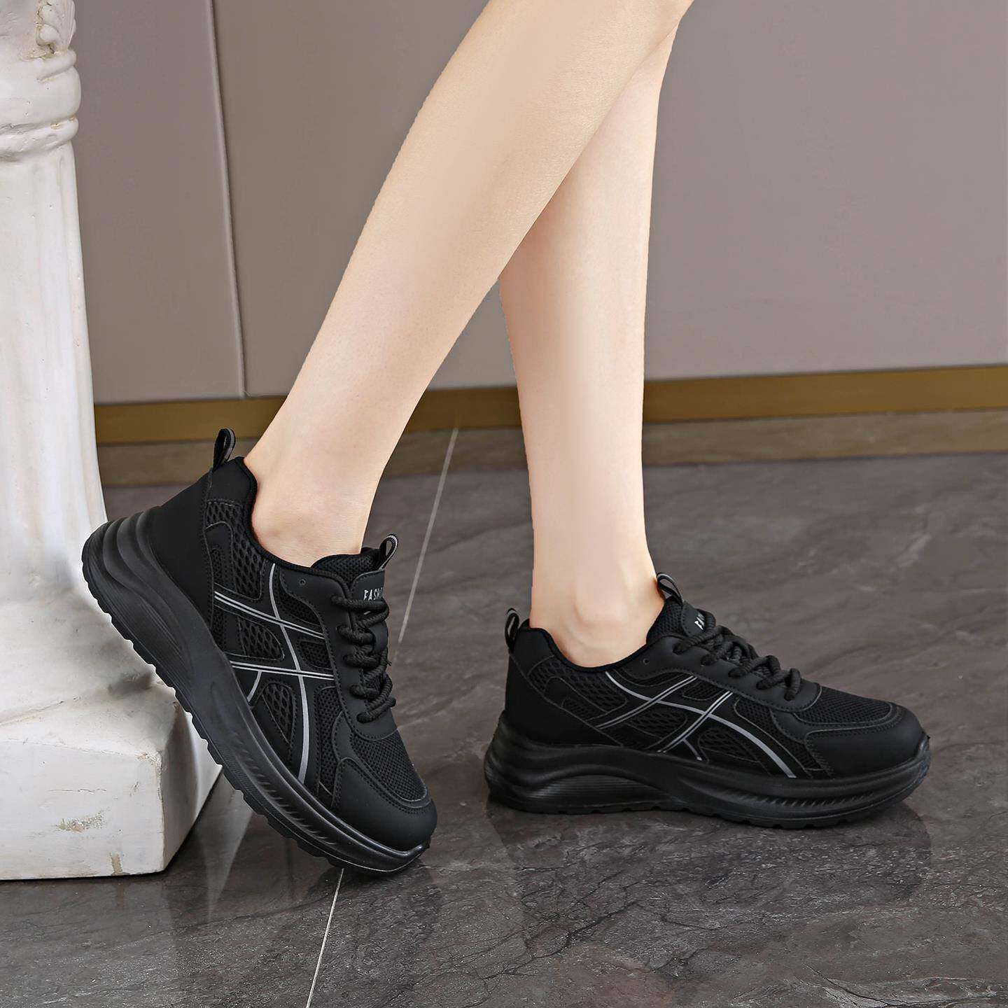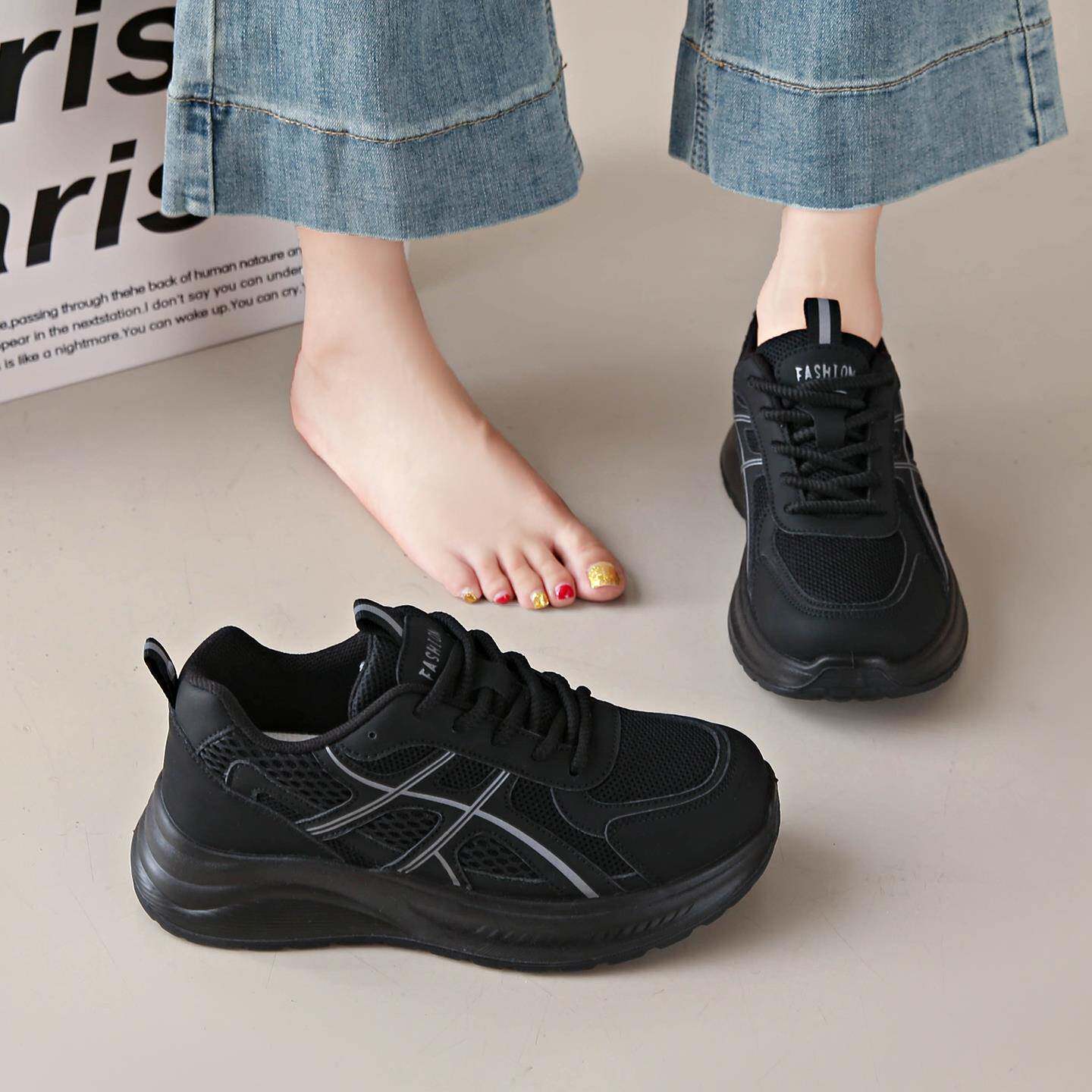 黑色运动鞋女款2025新款秋季透气网面小黑鞋厚底不累脚防滑老爹鞋