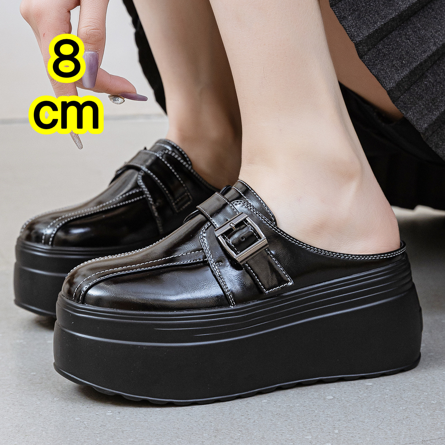 8cm厚底内增高乐福鞋女2026新小个子松糕鞋休闲百搭包头半拖单鞋