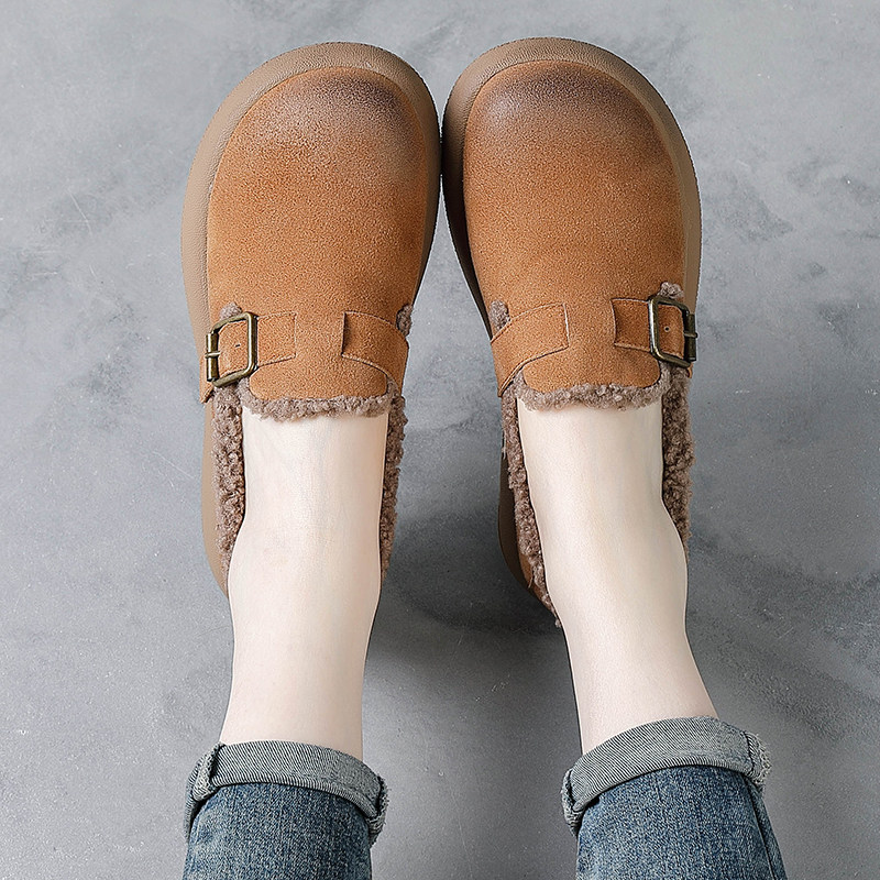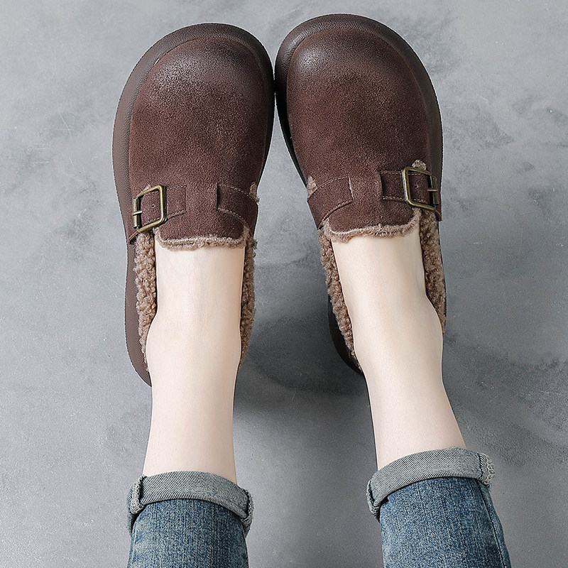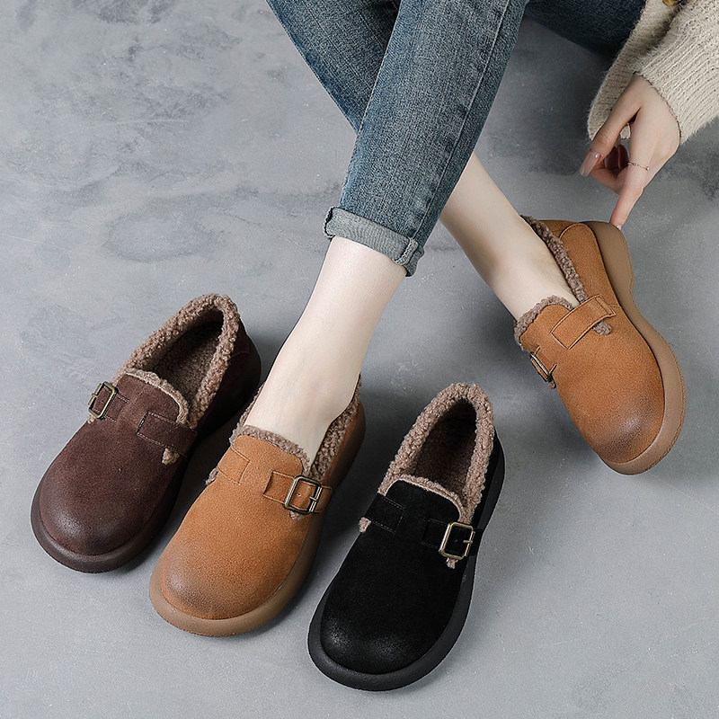头层牛皮勃肯鞋秋冬新款厚底毛毛鞋真皮棉鞋女加绒皮鞋保暖妈妈鞋