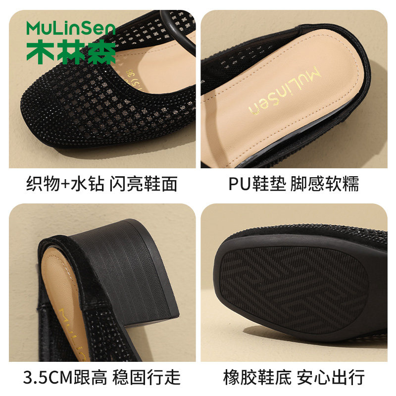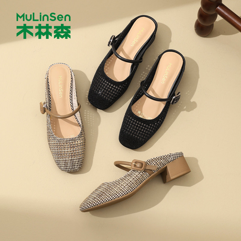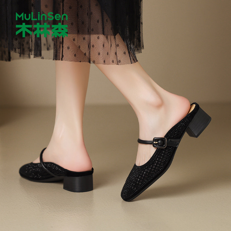木林森外穿女鞋2026新款夏季镂空透气包头半拖粗跟法式配裙子凉鞋