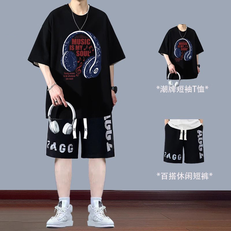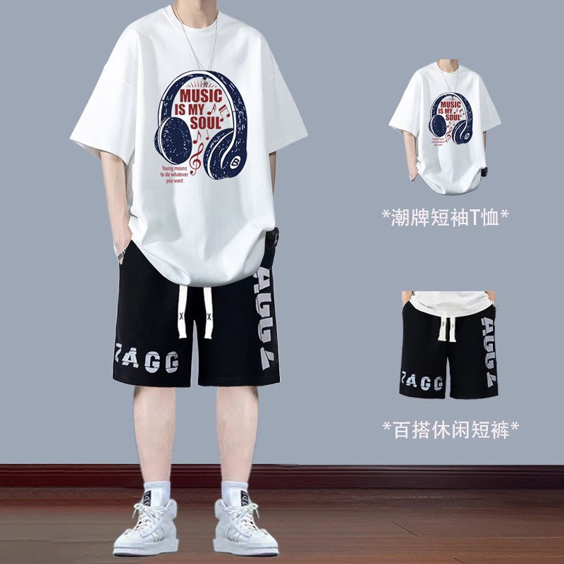 青少年纯棉短袖t恤男套装夏季2026初高中学生潮流短裤帅气两件套