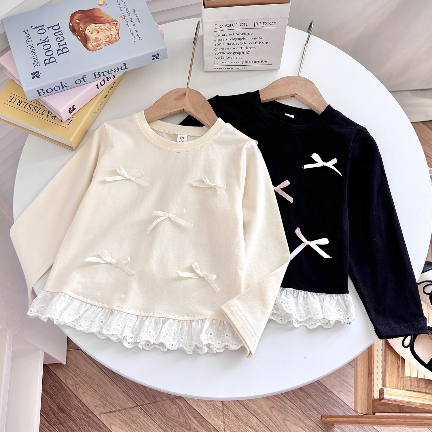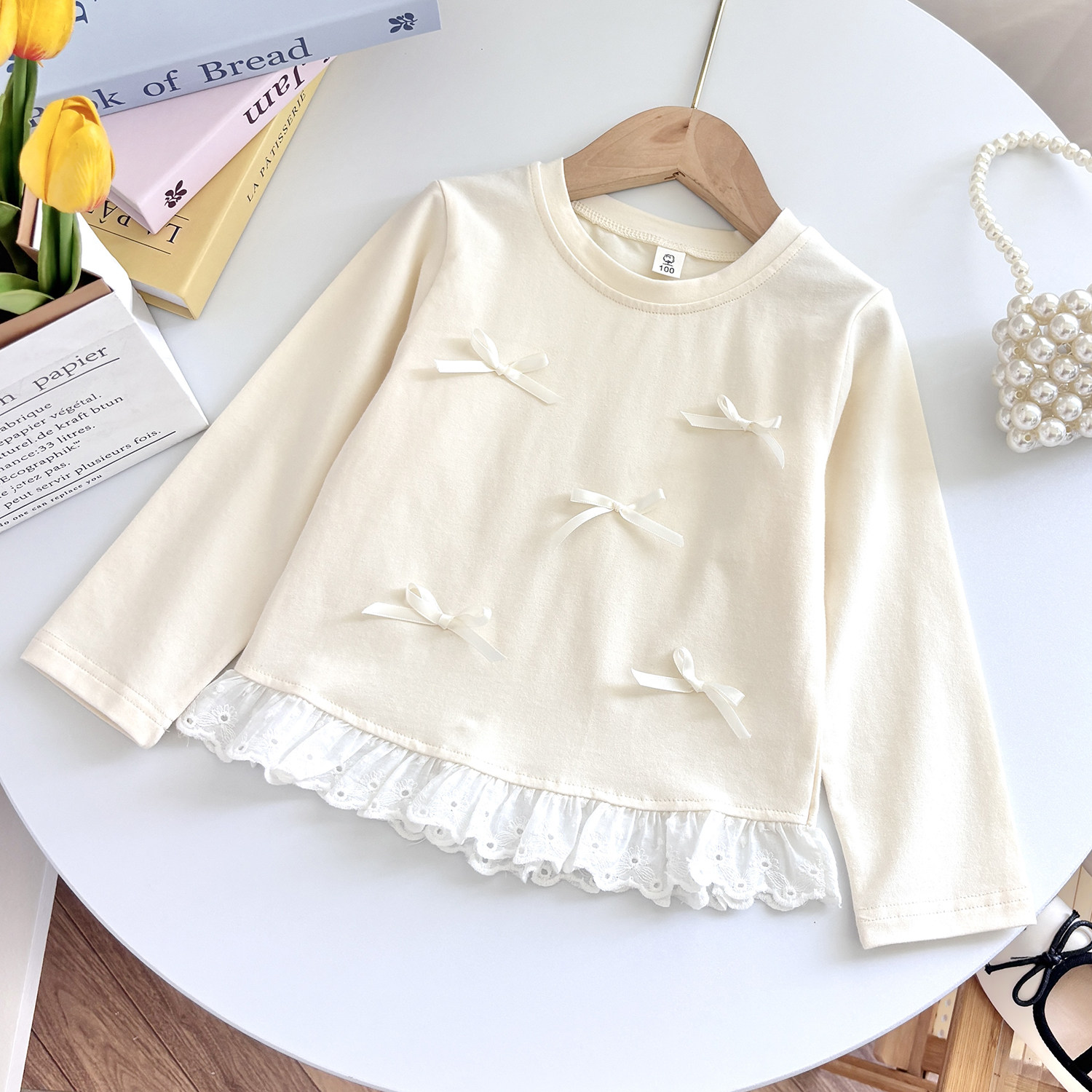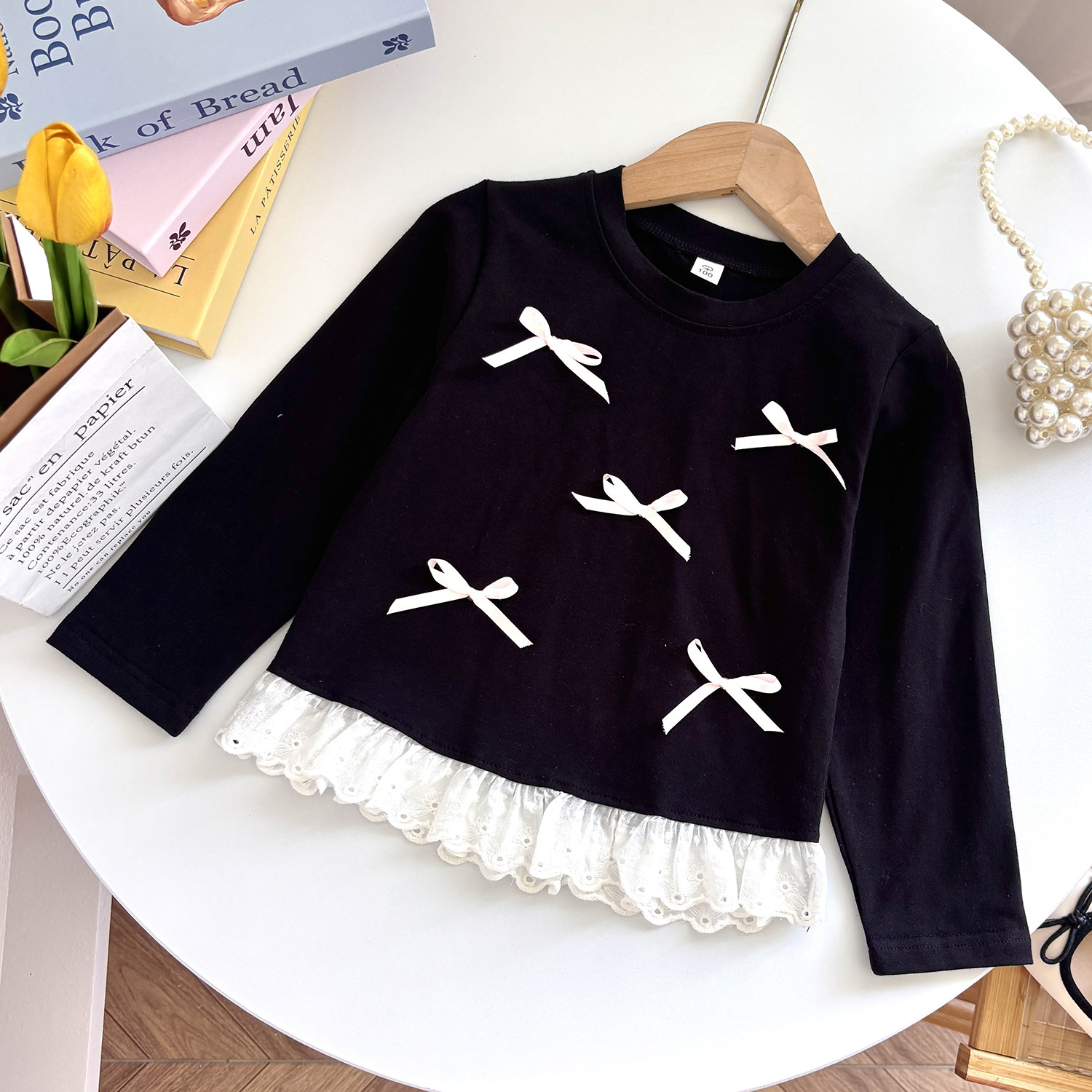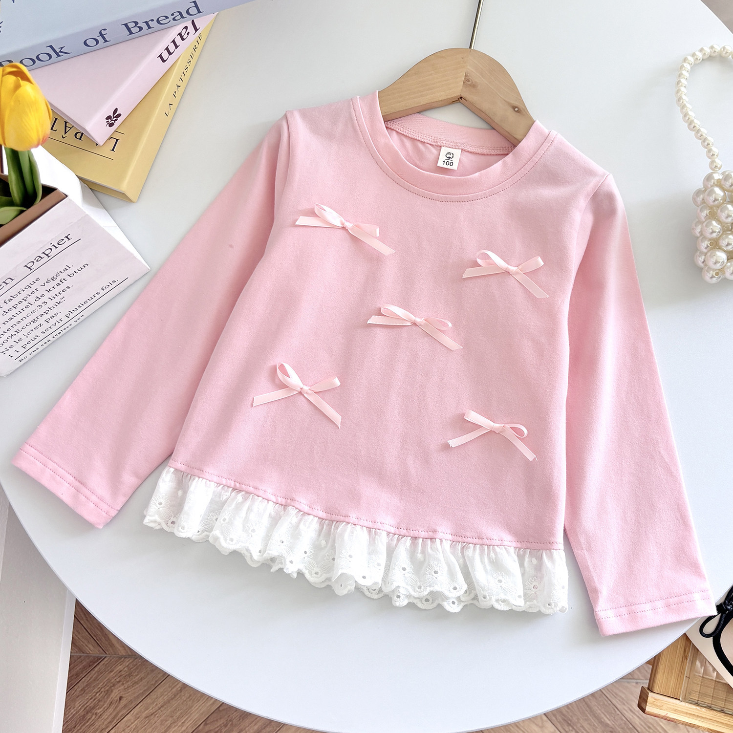 女童纯棉蕾丝花边蝴蝶结裙衫长袖t恤 26春秋儿童小女孩中长款上衣
