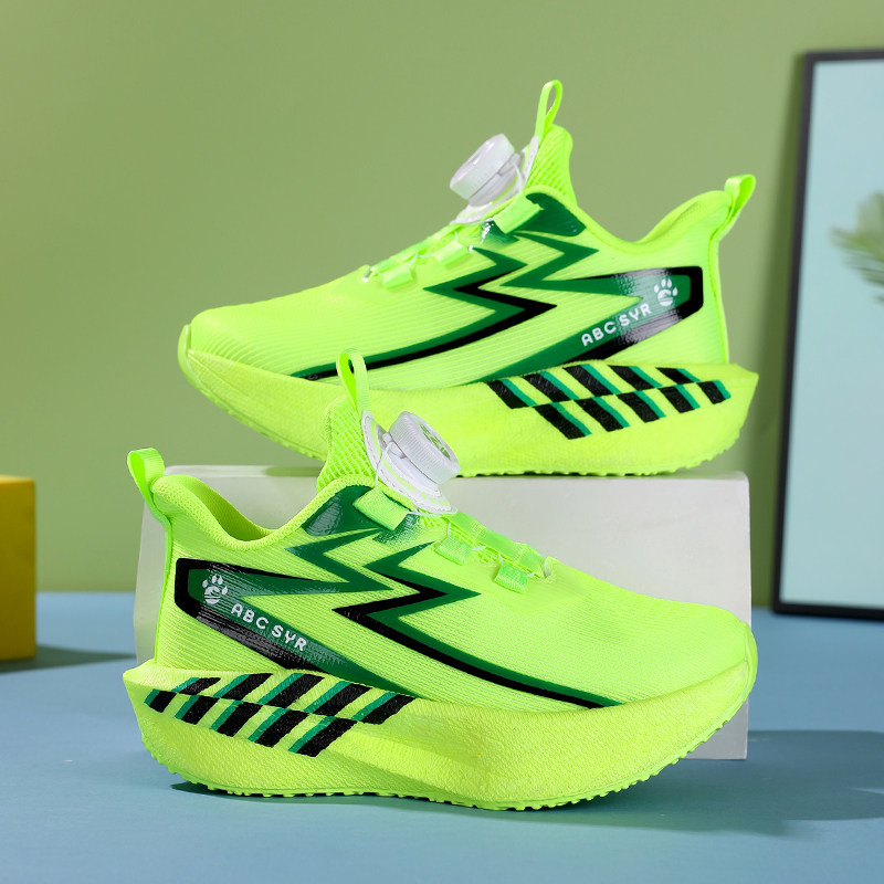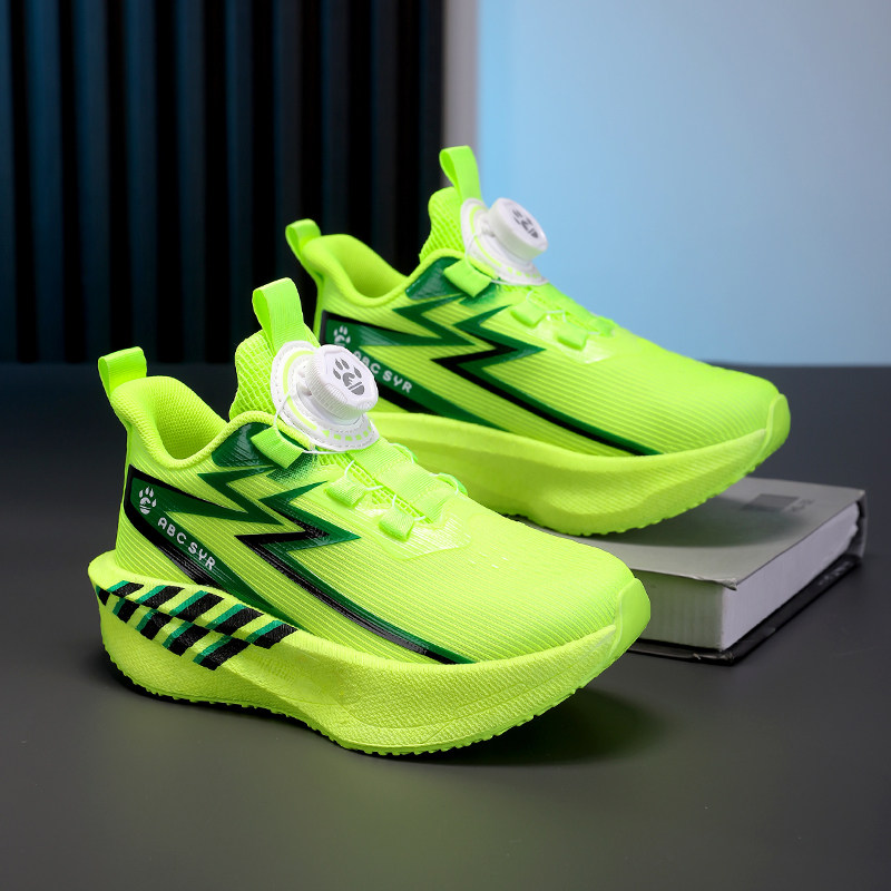 儿童运动鞋男童2026新款旋转纽扣网面透气中大童竞速跑步鞋荧光绿