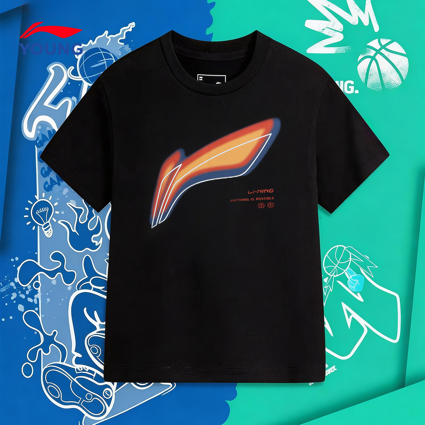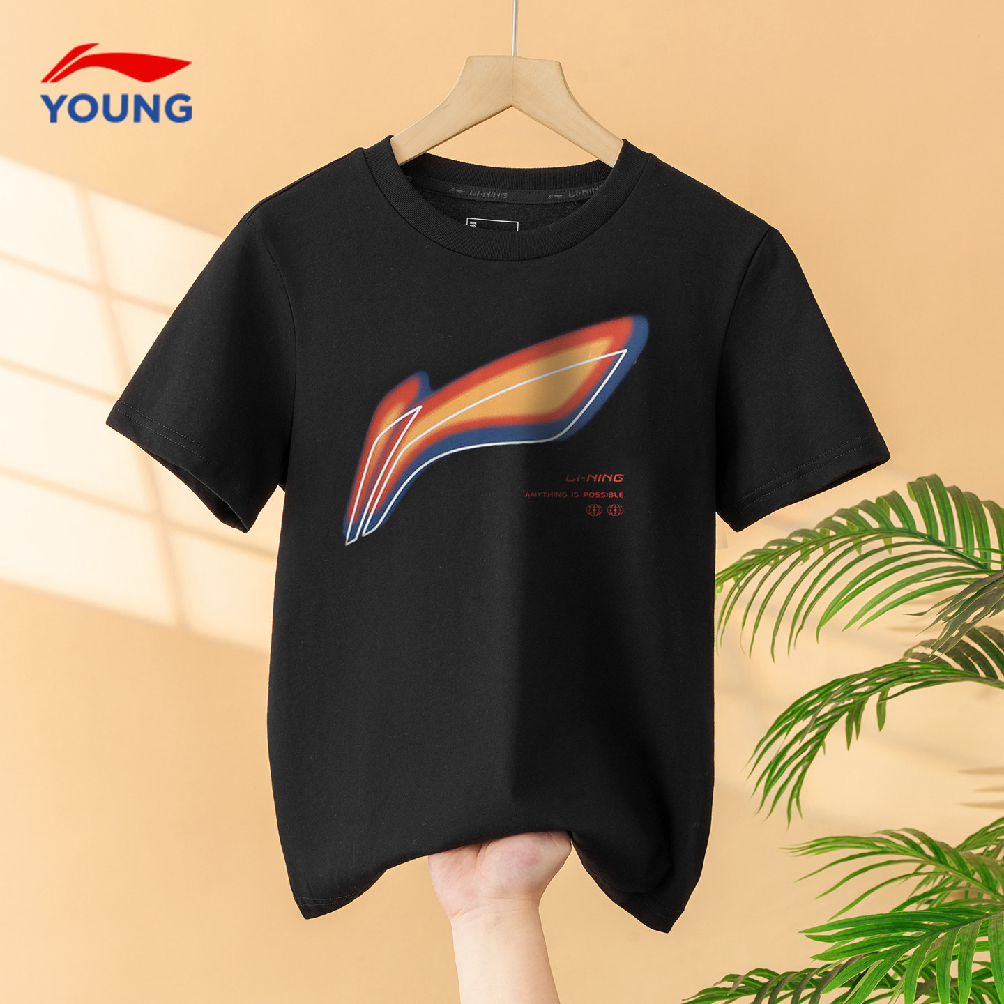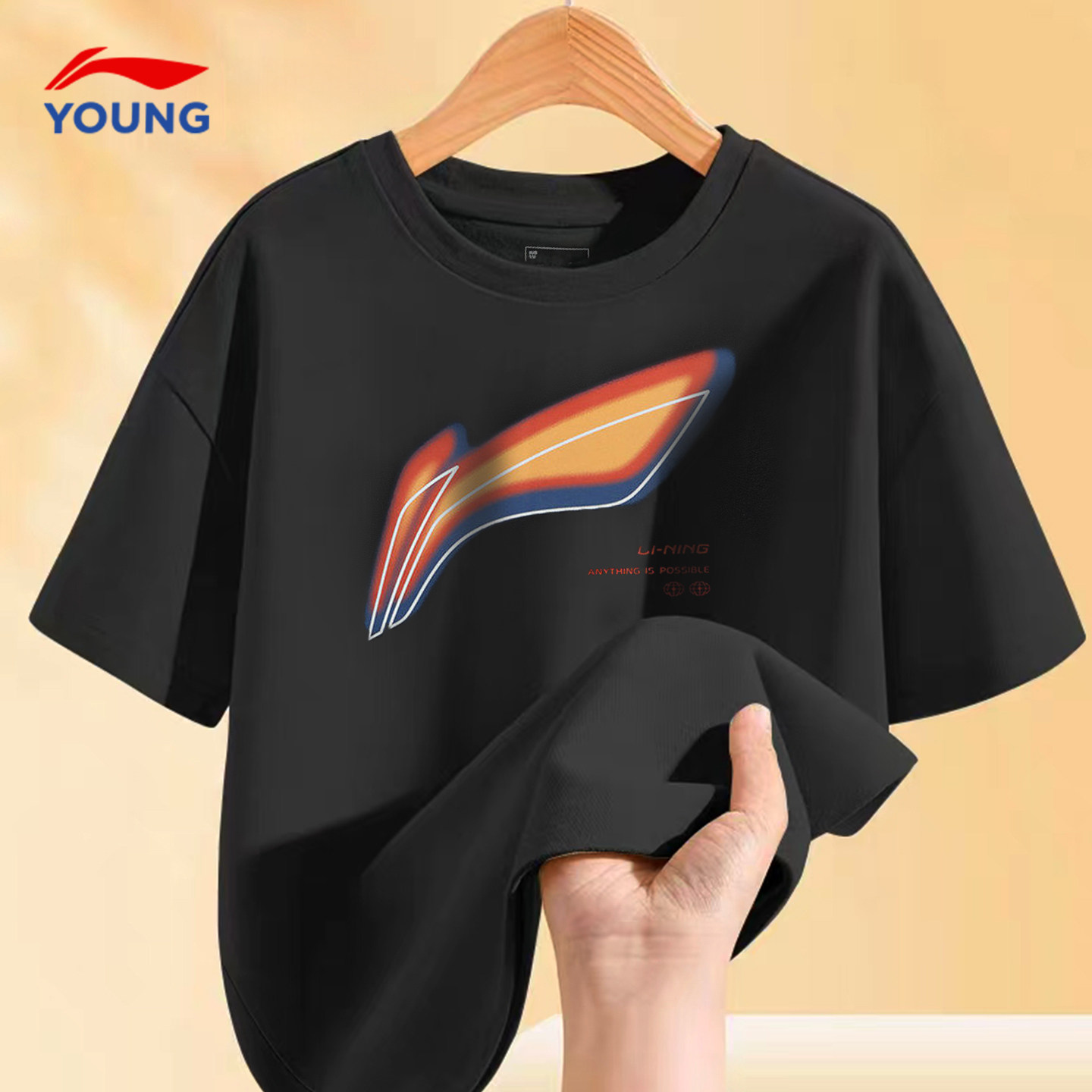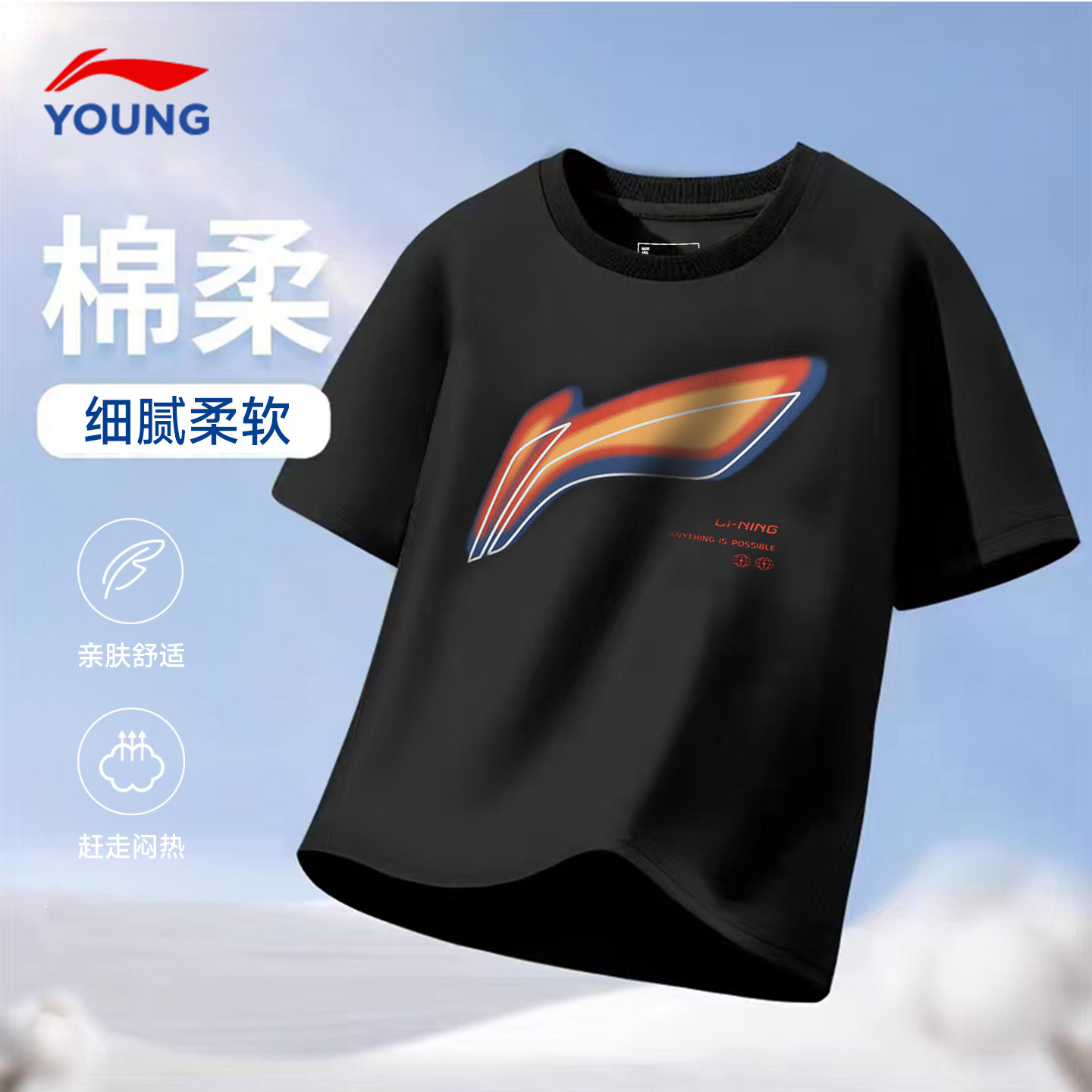 李宁男童短袖儿童纯棉抗菌户外运动T恤2026夏季男女大童黑色半袖
