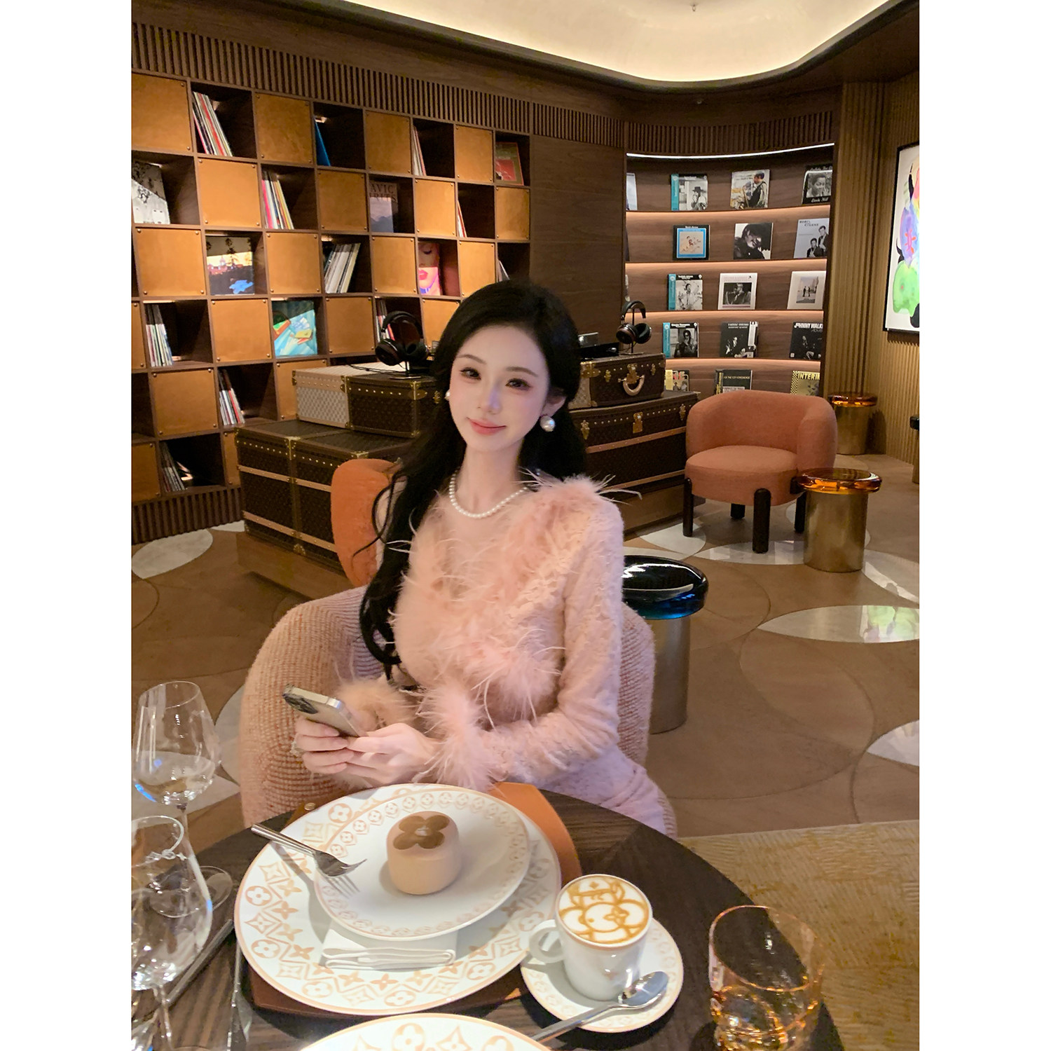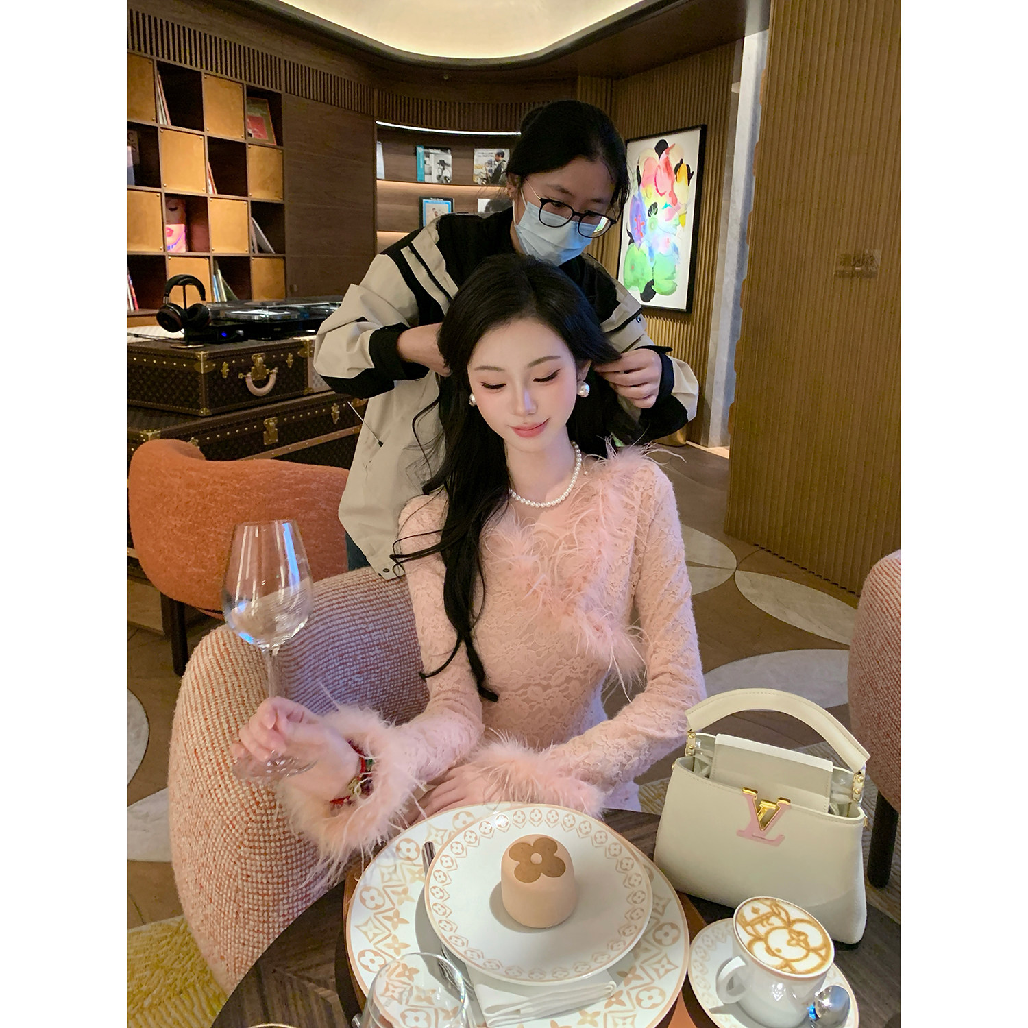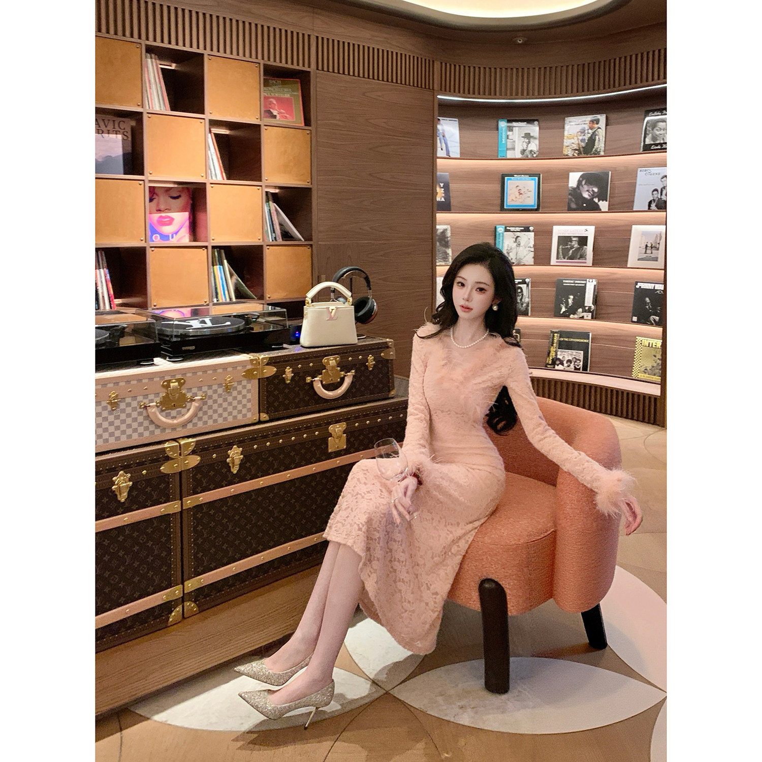 Sun雅乔【晚香玉】两个版本/秋冬粉色花卉蕾丝鸵鸟毛长款连衣裙