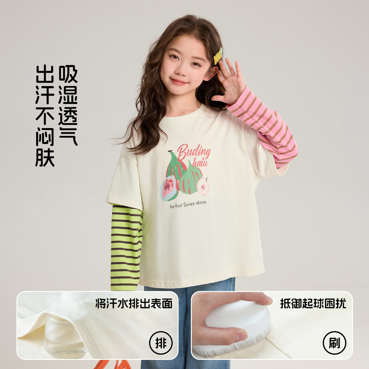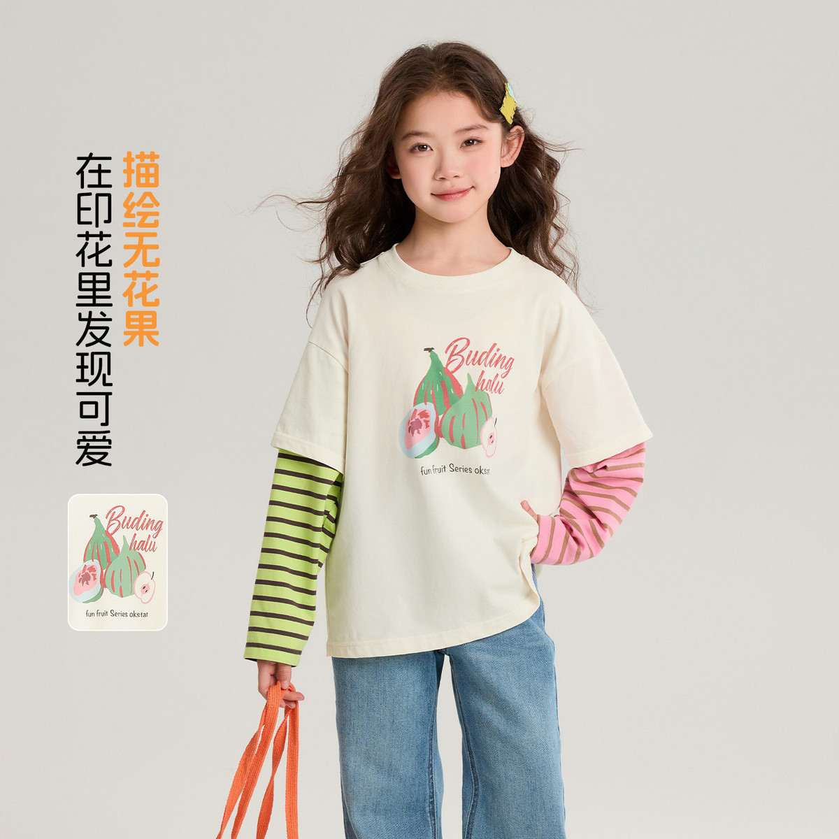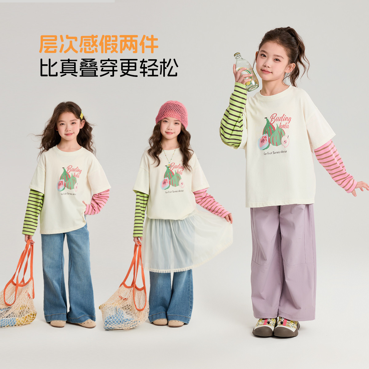 布丁哈鲁春装女童童装洋气上衣2026春季新款儿童撞色印花假两件